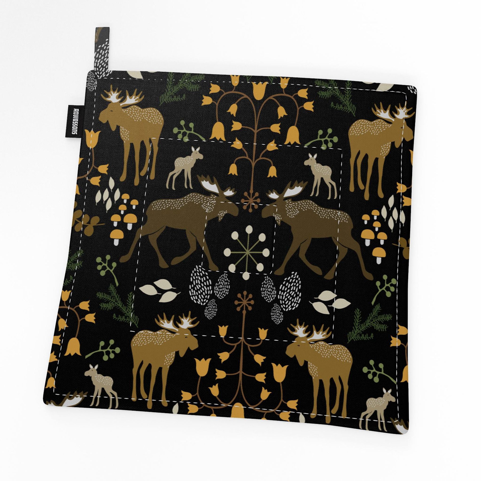 Skogens Konung svart grytlapp från Arvidssons Textil är en stilfull och praktisk köksdetalj. Den mörka bakgrunden med älgar och skogsmotiv gör köket personligt, samtidigt som den skyddar händerna när du hanterar varma kärl. Tillverkad i 100% bomull och utrustad med en praktisk upphängningsögla.