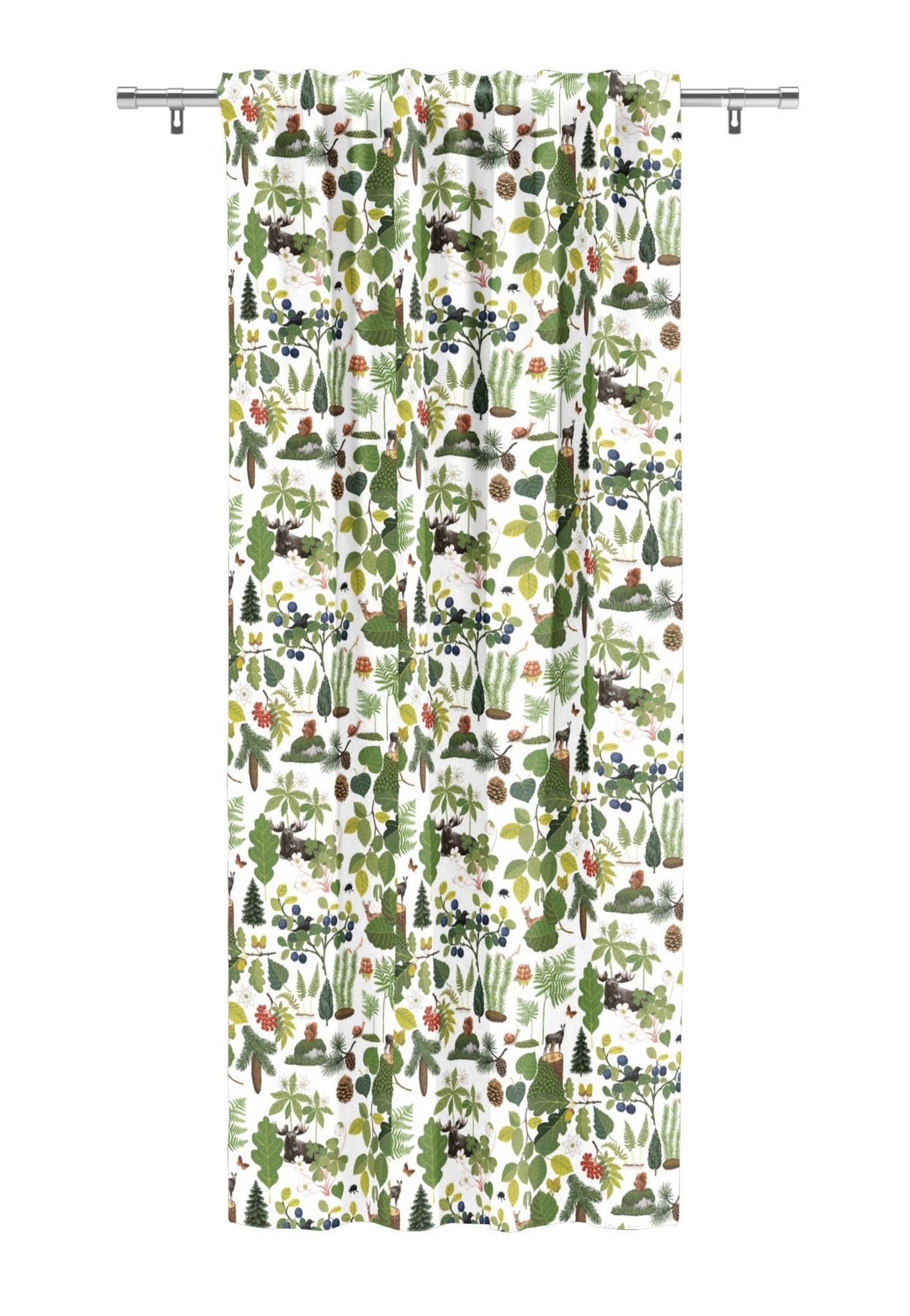 Upplev naturens skönhet med Skogsliv grön multibandslängd från Arvidssons Textil. Designad av MiaLotta Arvidsson-Mars, denna gardin fångar essensen av den svenska skogen med sina handmålade mönster.