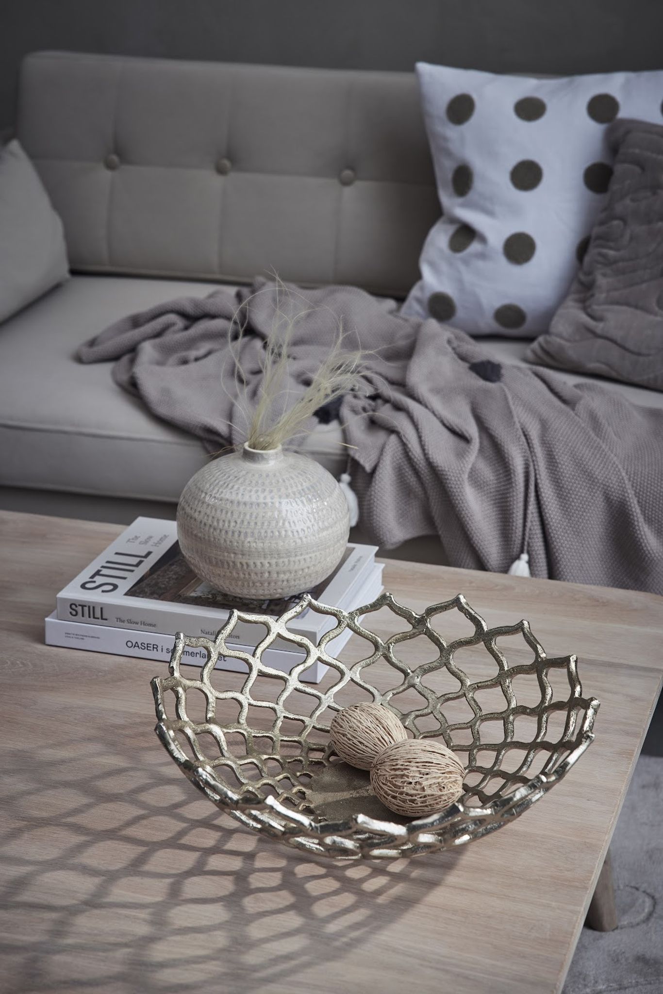 Ellie soffbord från Lene Bjerre är ett runt soffbord i vitkalkad ek som passar i vardagsrummet, loungen eller som vardagsrumsbord i mindre sällskapsytor. Med sina rundade kanter ger det en mjukare känsla och fungerar både som samlingspunkt för fika och som yta för böcker och prydnader.