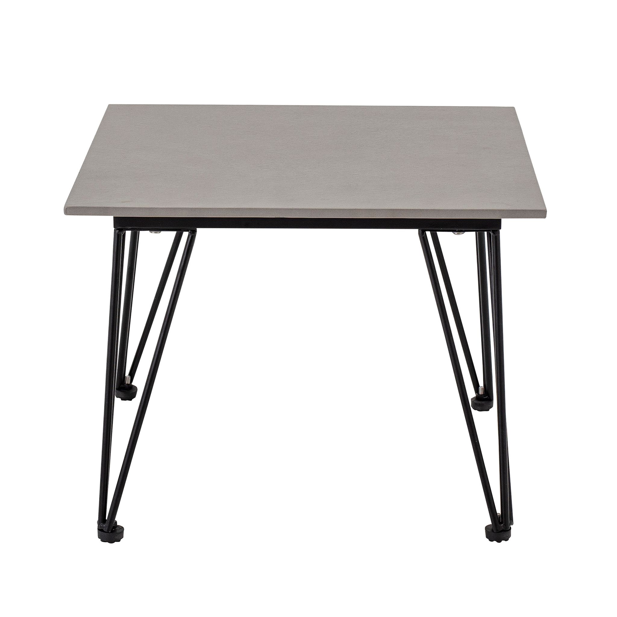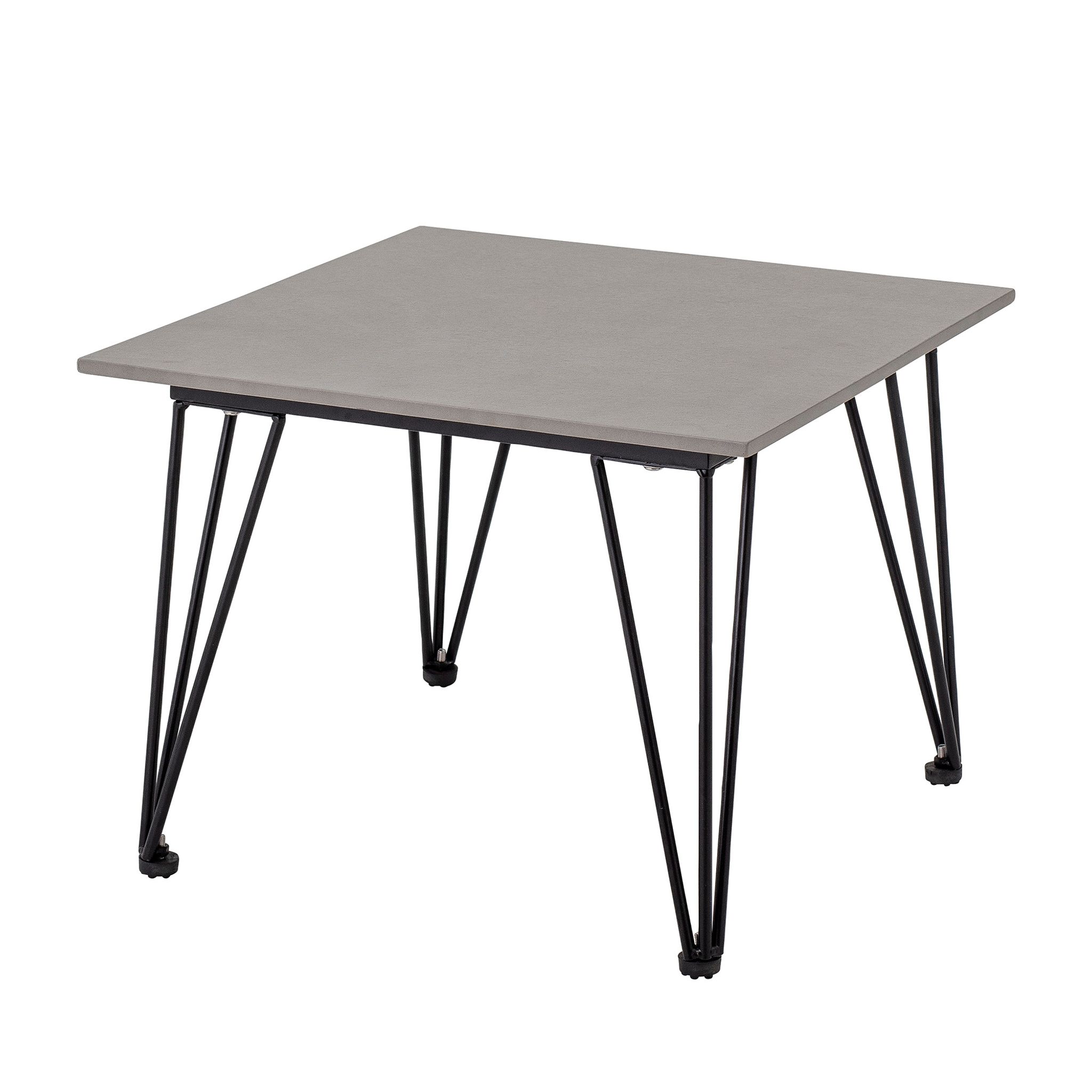 Mundo soffbord i grå fibercement, 55×55×42 cm, från Bloomingville med svarta metallben. Snygg och praktisk – passar din terrass eller trädgård, funkar bra utomhus och håller länge.