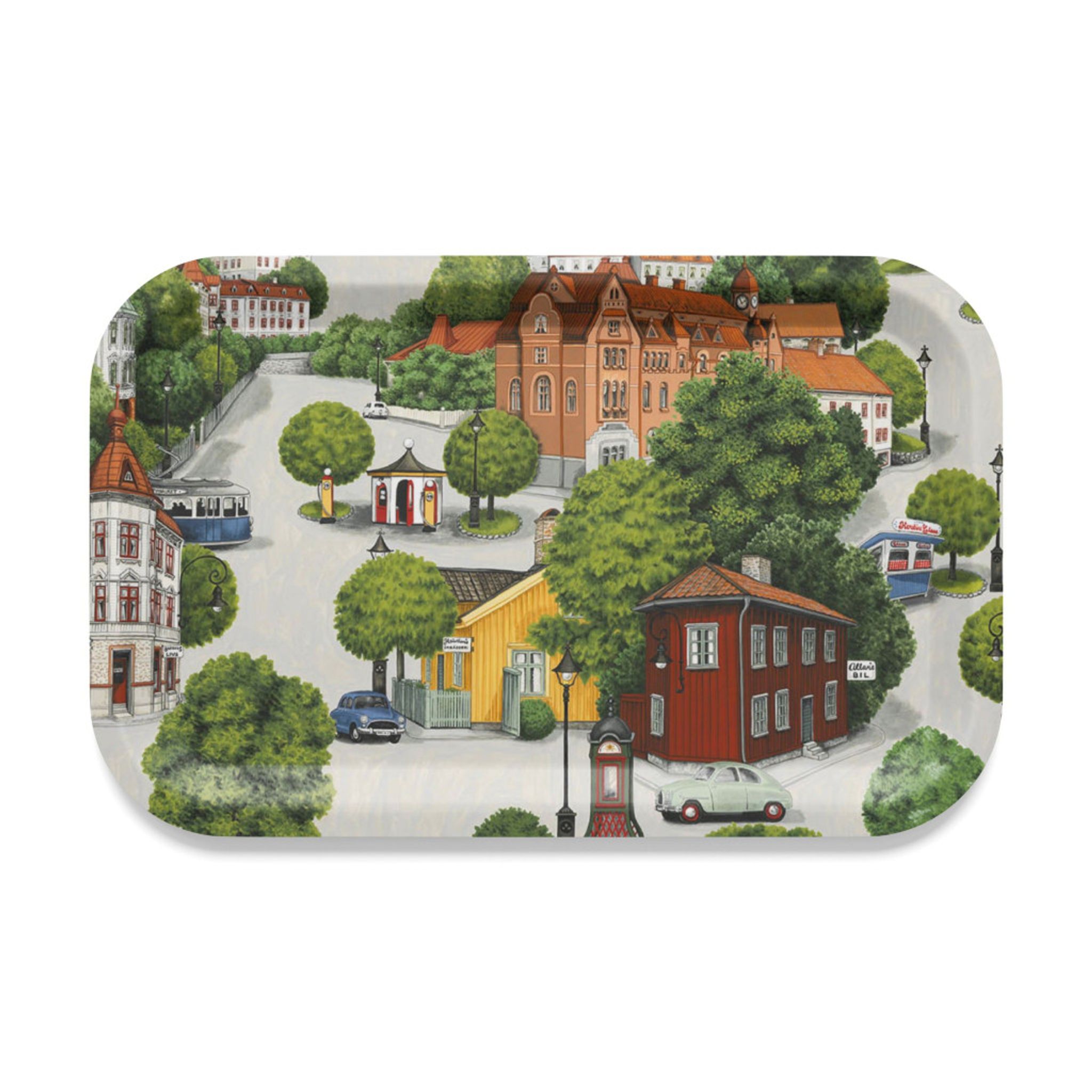 Upptäck den unika Sommarstad multi bricka från Arvidssons Textil, designad av MiaLotta Arvidsson-Mars. Denna vackra bricka är ett hantverk av högsta kvalitet, där varje mönster är handmålat och inspirerat av det historiska Göteborg.