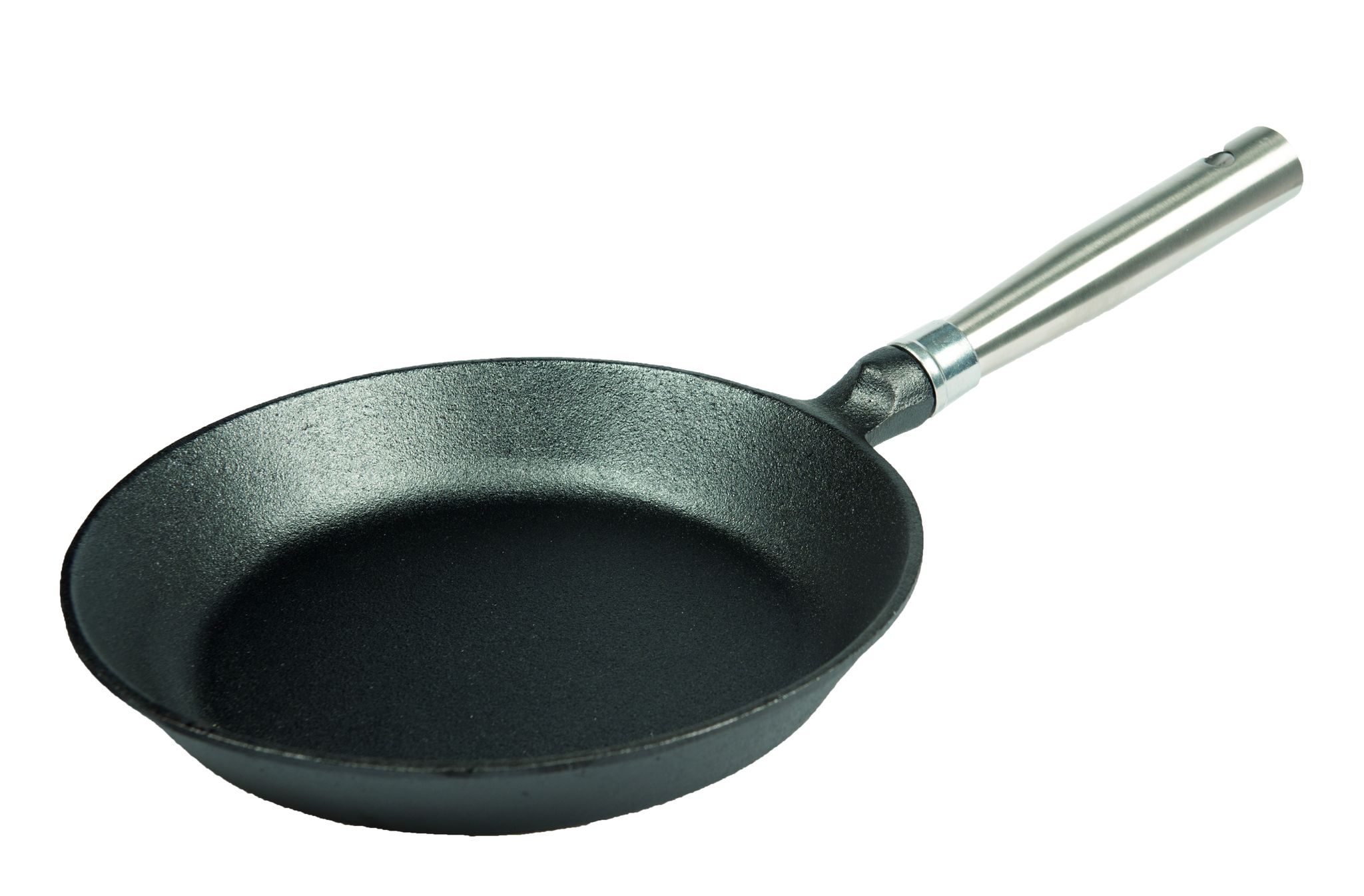 Upptäck Ronneby Bruks mångsidiga stekpanna Ø24 cm, perfekt för vardagsmatlagning och utomhusgrillning med rostfritt skaft för öppen eld.