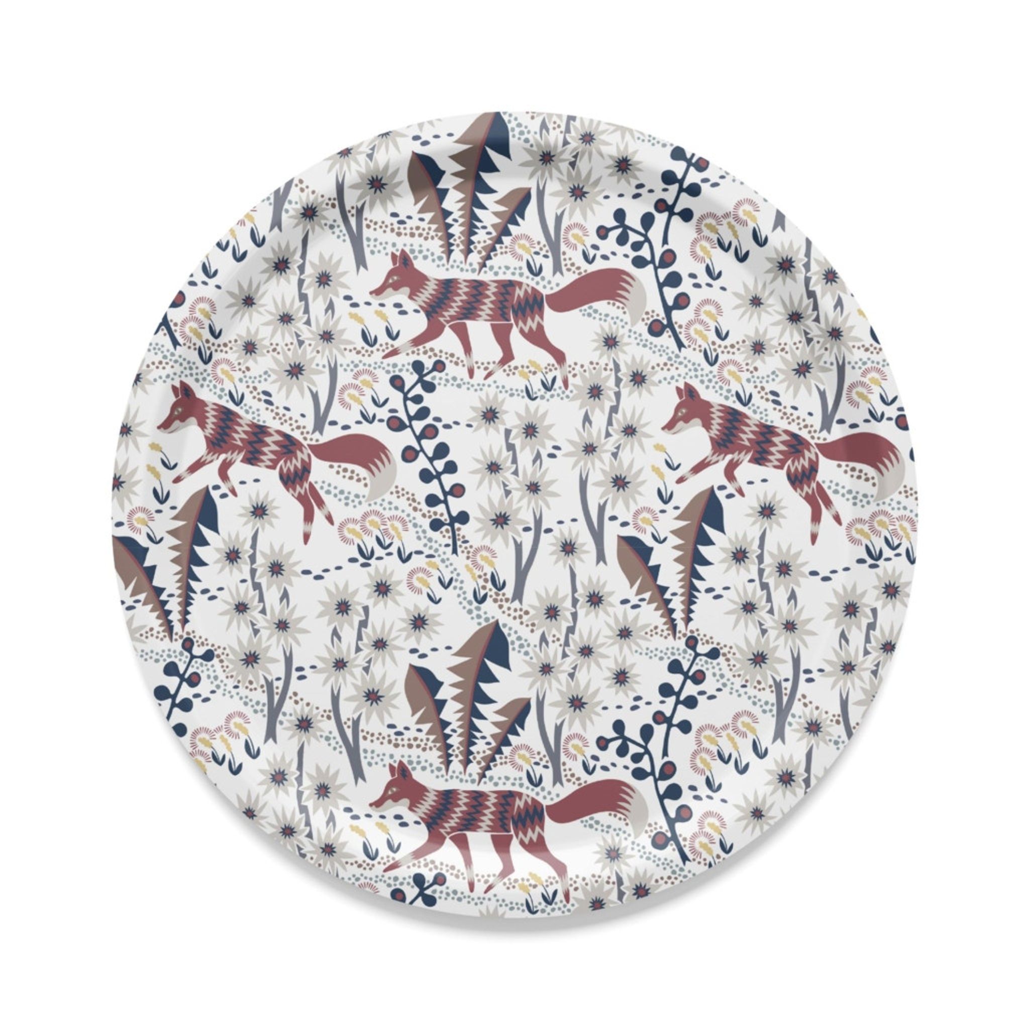 Stjärnspeja rund bricka i beige och röd från Arvidssons Textil. Tillverkad i björkfanér och formgiven av Hanna Werning. Den naturnära färgpaletten och det lekfulla mönstret gör brickan till en iögonfallande detalj i kök, vardagsrum eller matsal.