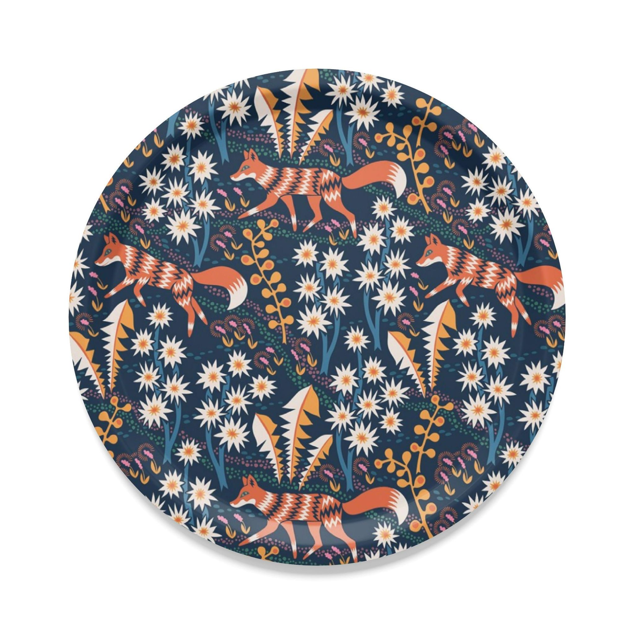 Stjärnspeja mörkblå rund bricka Ø31 cm från Arvidssons Textil. Tillverkad i björkfanér med Hanna Werning som designer och ett lekfullt mönster i mörkblå nyans. En elegant bricka som passar både som serveringsbricka och som inredningsaccent i kök eller vardagsrum.