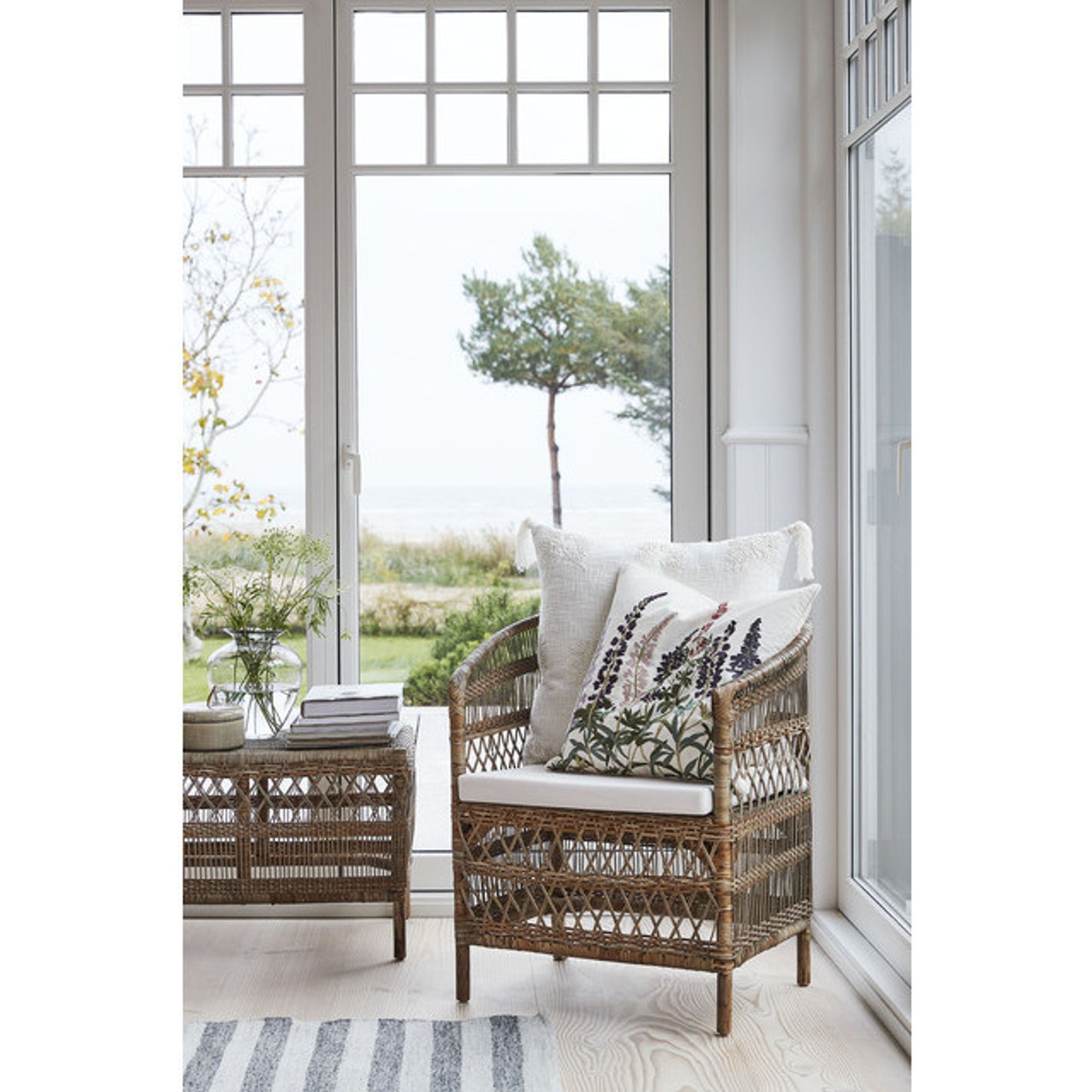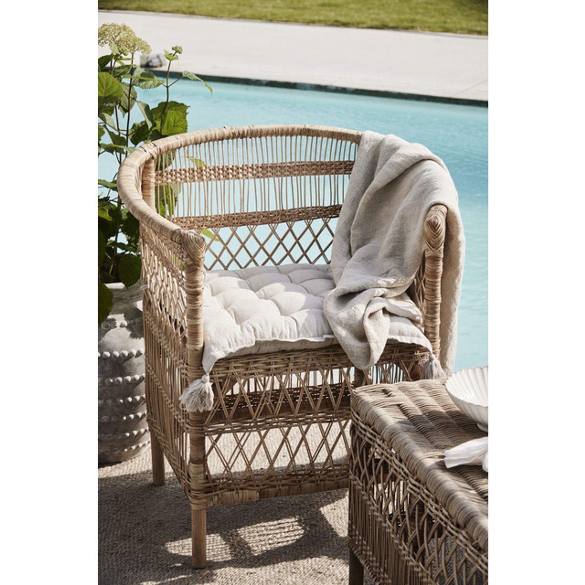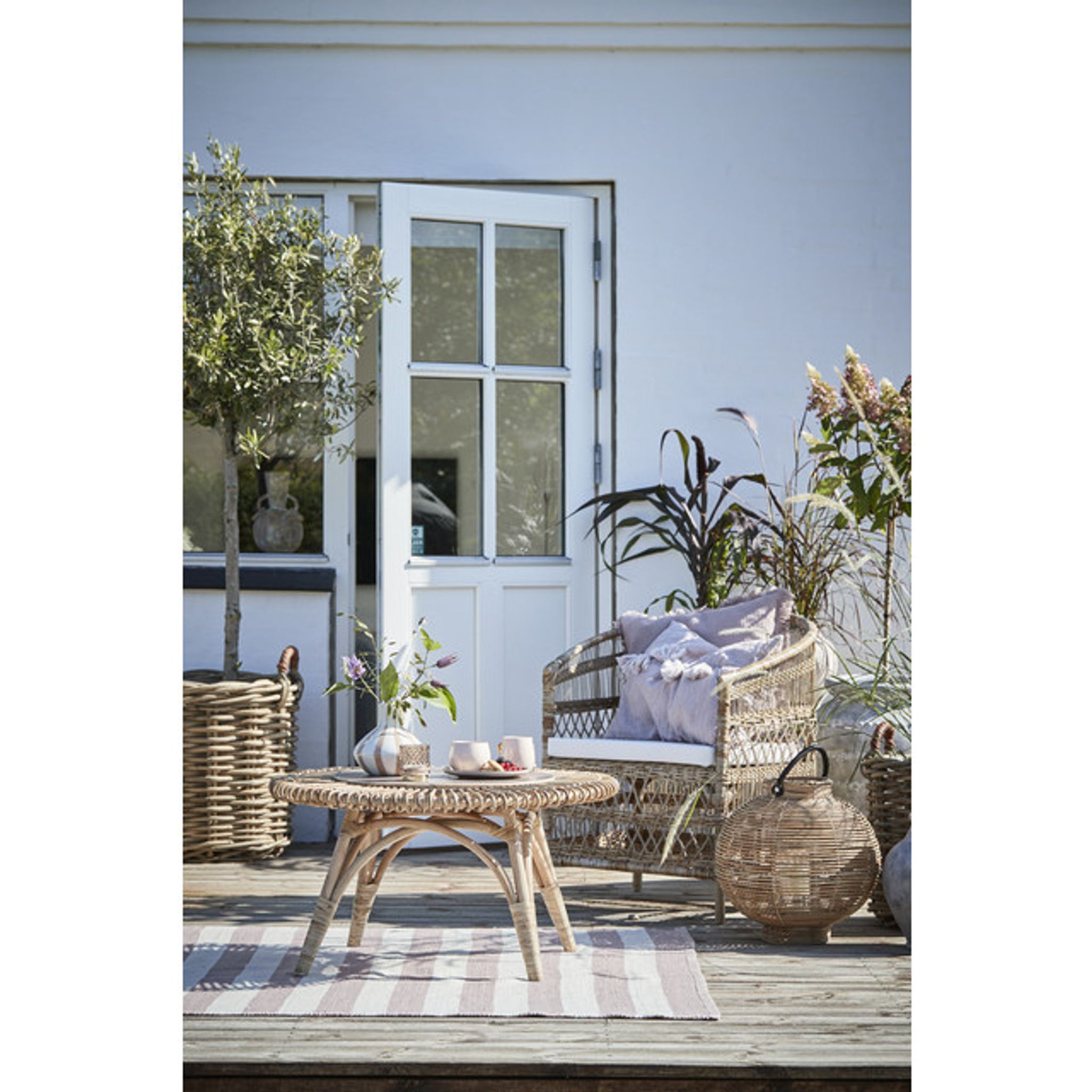 Norah Natur rottingstol från Lene Bjerre är en handgjord stol i naturmaterial som passar i vardagsrum, läshörna eller på en täckt uteplats. Den ger en bekväm sittplats för avkoppling eller när du får gäster och bidrar till en varm, naturlig känsla i din inredning.