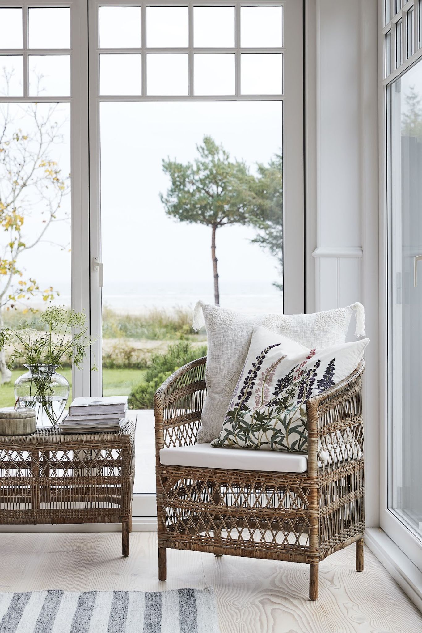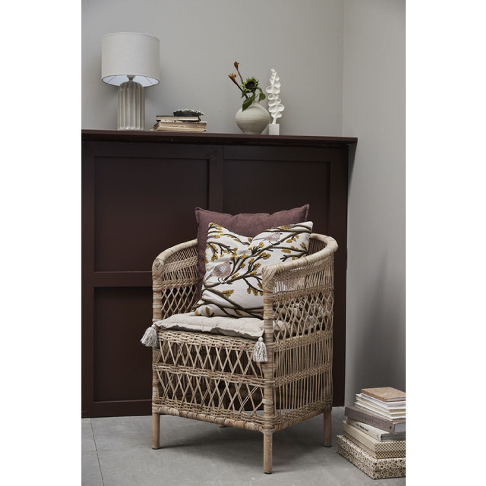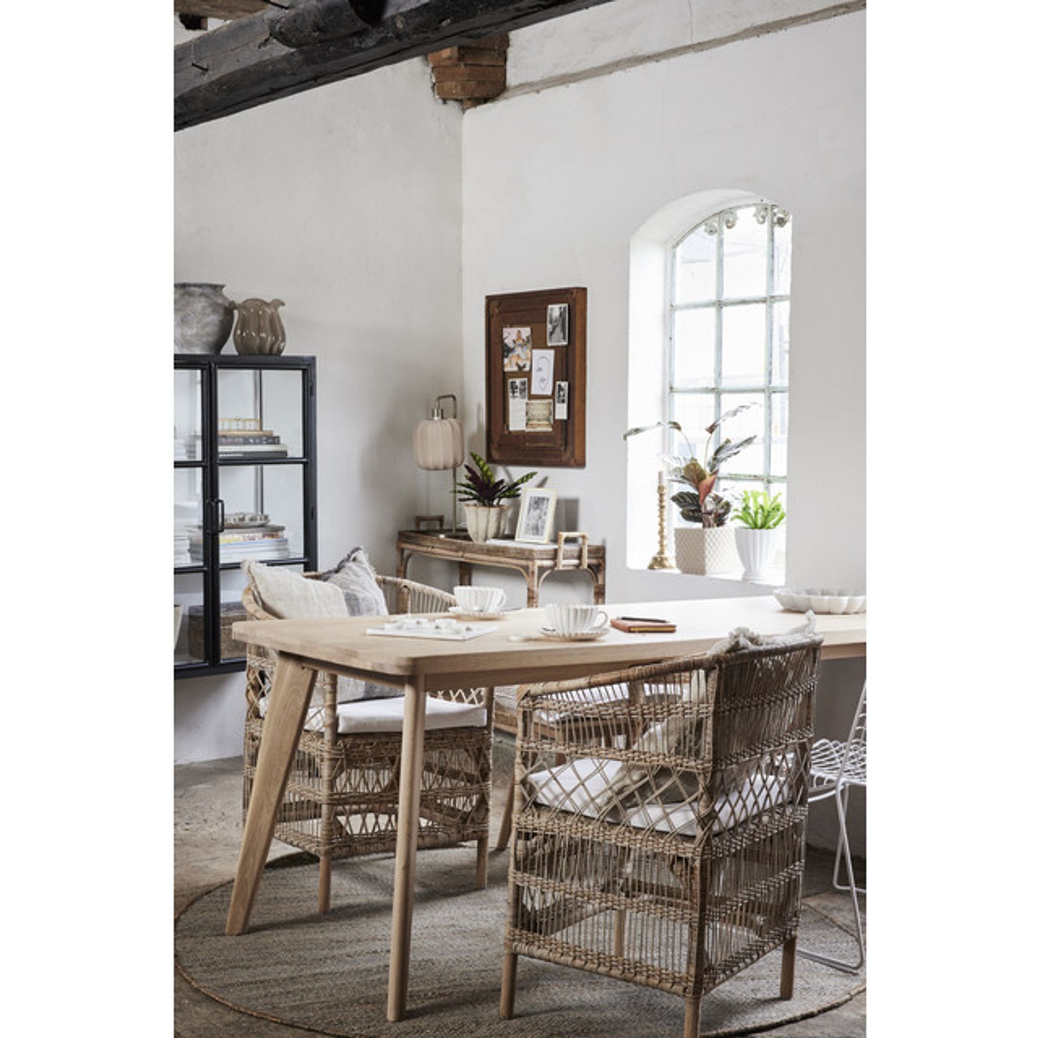 Norah Natur rottingstol från Lene Bjerre är en handgjord stol i naturmaterial som passar i vardagsrum, läshörna eller på en täckt uteplats. Den ger en bekväm sittplats för avkoppling eller när du får gäster och bidrar till en varm, naturlig känsla i din inredning.