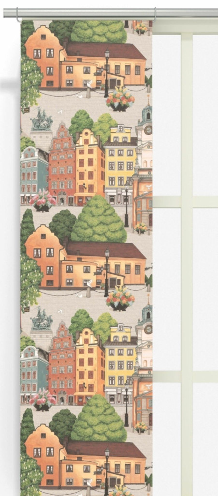 Stortorget multi panellängd 2-pack från Arvidssons Textil erbjuder en stilren fönsterlösning i mjuk bomull med ett färgstarkt citymönster i färgtonen Multi.