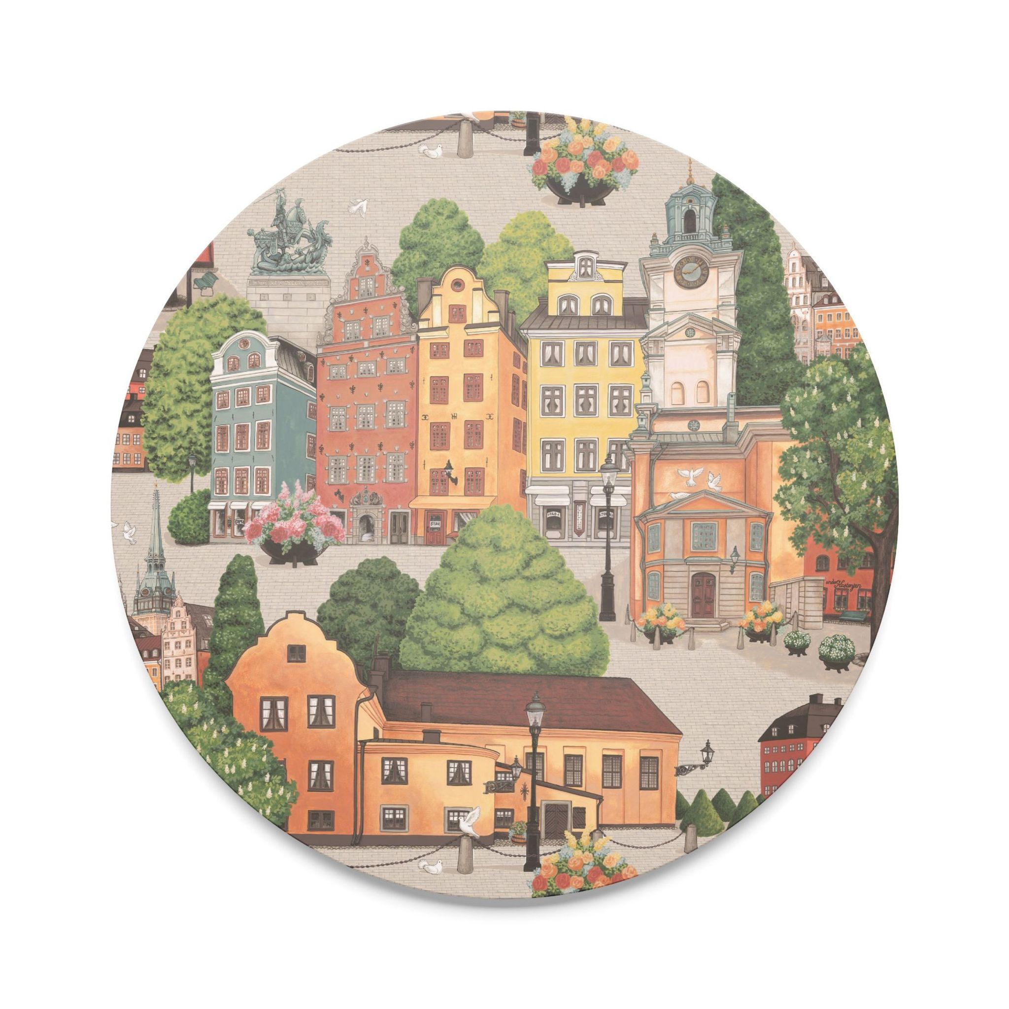 Stortorget runt grytunderlägg Arvidssons Textil ger bordet skydd med stil. Tillverkat av MDF med ett färgrikt stadsmotiv och designat av Mialotta Arvidsson Mars, exklusivt för Arvidssons Textil. Perfekt som underlägg för grytor och kastruller i köket eller vid serveringsbordet.