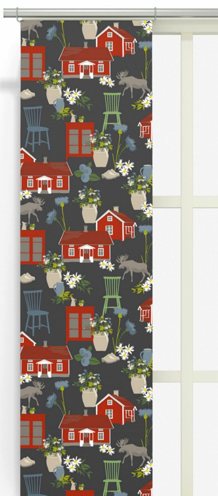 Upptäck den nordiska charmen med Strövtåg grå panellängd från Arvidssons Textil. Detta 2-pack är designat i samarbete med den kreativa studion Björk-Forth och bjuder på ett unikt mönster med röda stugor, pinnstolar och en vandrande älg, vilket ger en autentisk skandinavisk känsla till ditt hem.