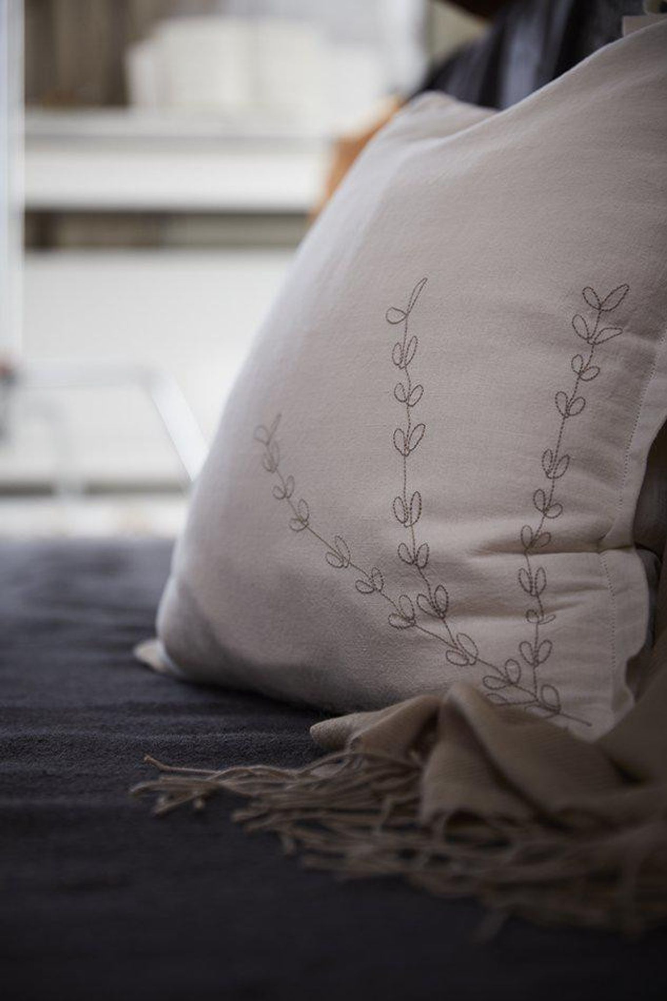 Amie-kuddfodralet i tunn halvlinnekvalitet ger en mjuk, tvättad känsla som passar både avslappnade och mer uppställda rum. Broderiet är en genomtänkt detalj som lyfter helheten utan att ta över. Knytbandet håller innerkudden på plats och gör att du lätt kan byta eller tvätta fodralet.