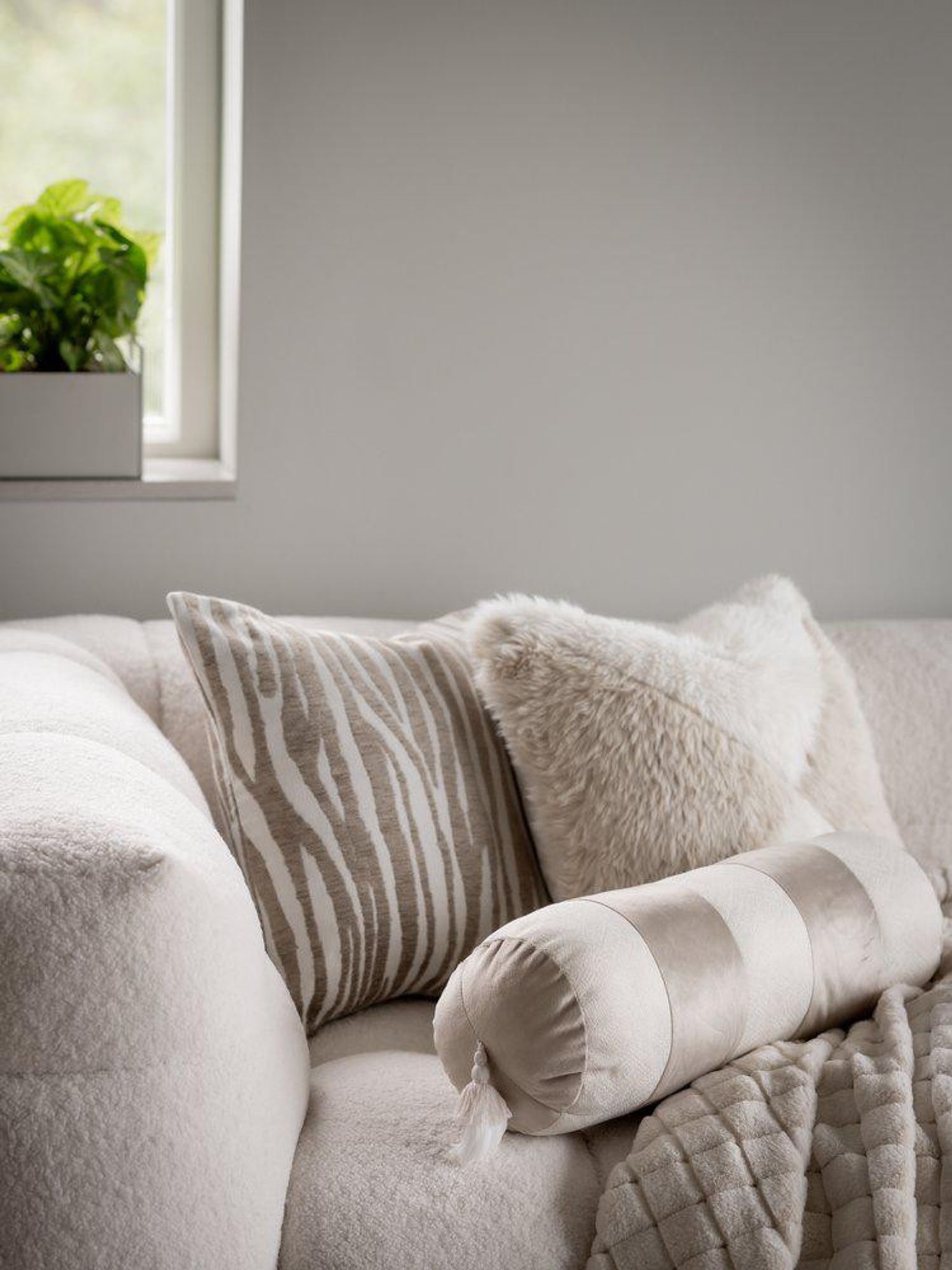 - Cylinderformad design: En cylinderkudde som fungerar som dekoration eller som extra stöd i din soffa.