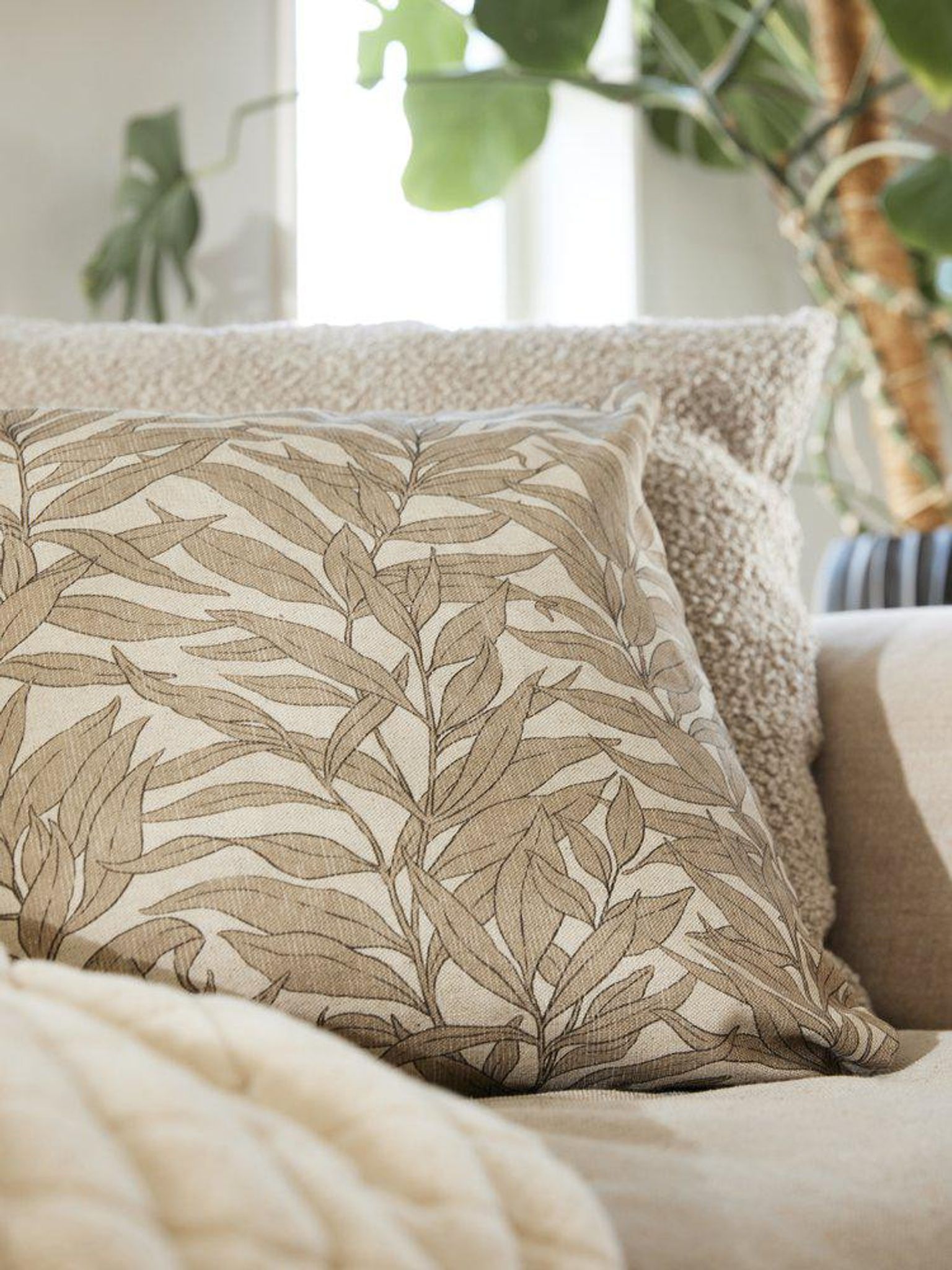 - Botaniskt mönster: Ett beiget kuddfodral med naturinspirerat motiv som lyfter rummet.