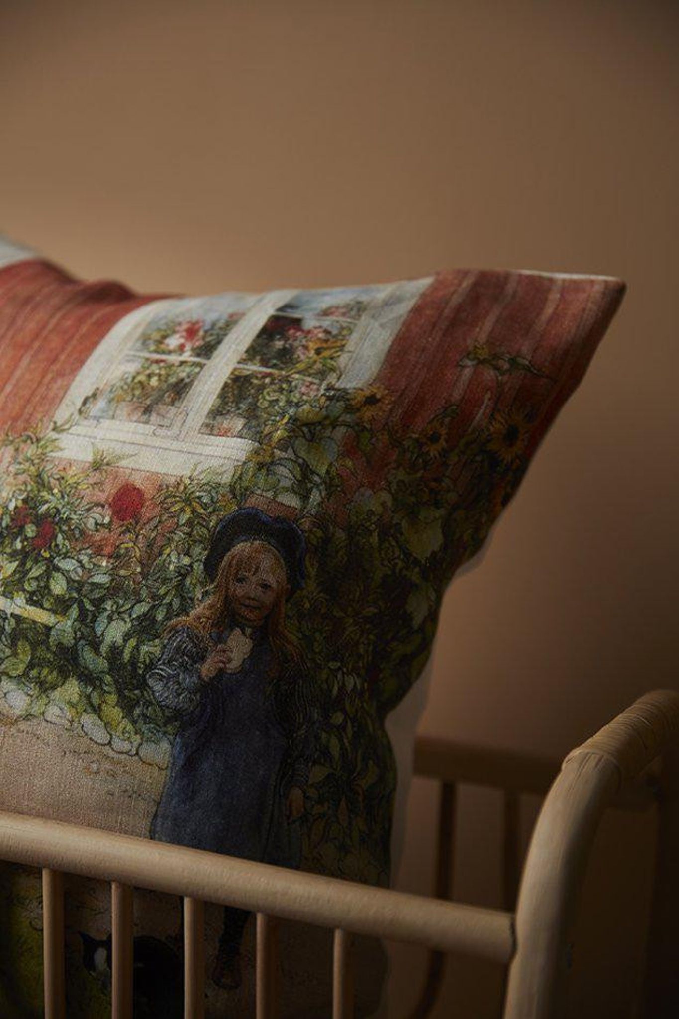 Brita kuddfodral i grön linne med Carl Larsson-motiv är ett kuddfodral i storlek 45x45cm som passar i soffan, fåtöljen eller på sängen när du vill ge rummet mer karaktär. Den dolda dragkedjan gör det enkelt för dig att byta innerkudde och skapa en fylligare look.