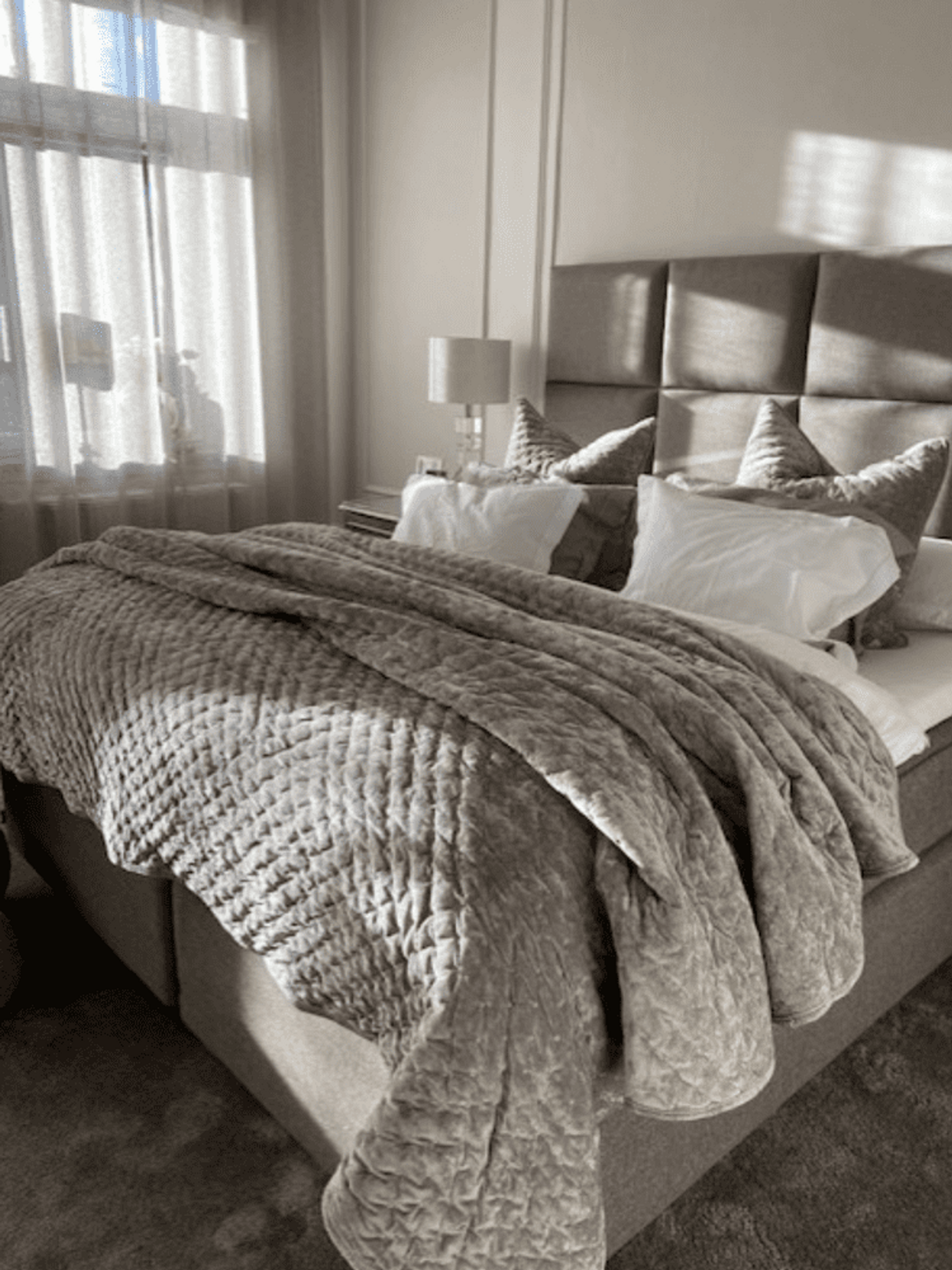 - Quiltad sammet: Ger en mjuk och följsam yta som ökar komforten när du ligger eller sitter i sängen.