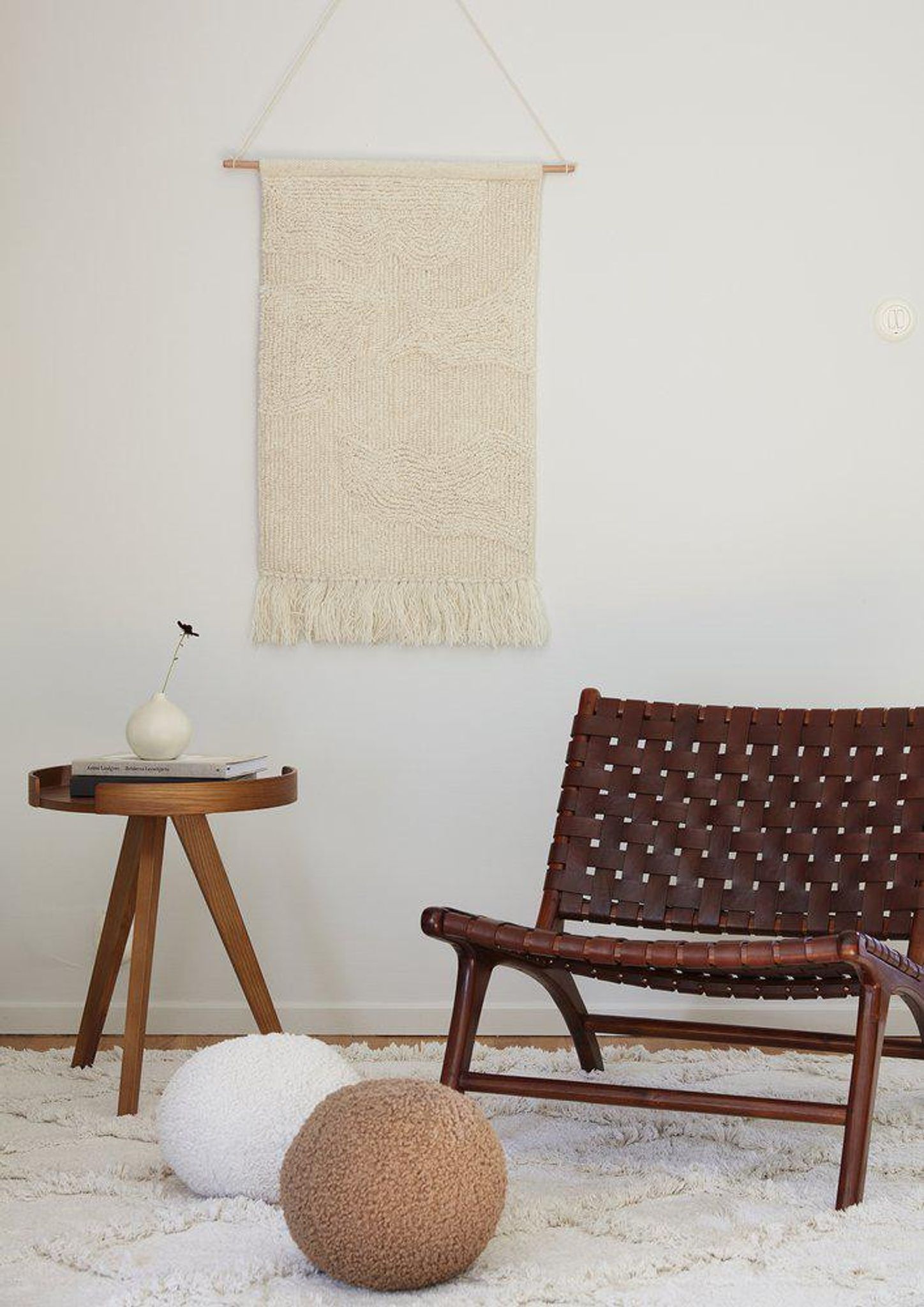 Handvävd ullbonad Cloud 50x100 cm i offwhite med tuftat mönster och träpinne, snygg och håller länge. Den passar i ditt hem och funkar bra som väggbonad, praktisk att hänga med träpinnen.