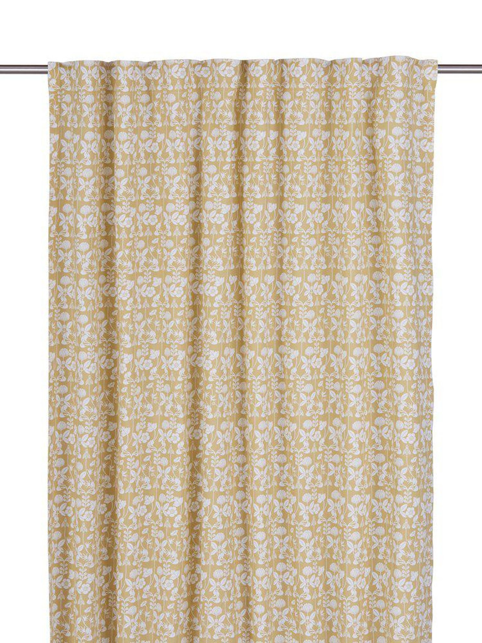 Installation är enkel — använd det medföljande multibandet och kombinera gärna med passande gardinstänger eller ringar. Färgen är beige-gul med botaniskt mönster som kompletterar flera färgscheman. Avsedd för inomhusbruk.