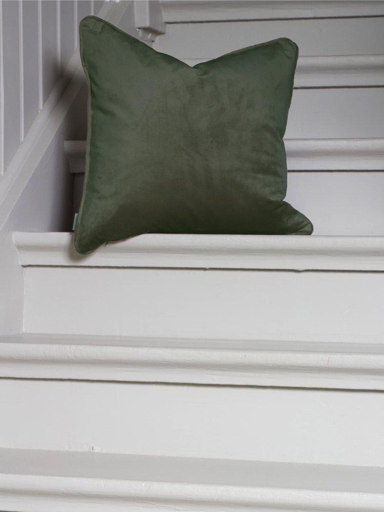 Estelle kuddfodral 45x45 cm i mossa-grön sammet med dold dragkedja och piping. Passar i din soffa eller säng, funkar som dekor och håller länge (Martindale 30.000); en snygg, praktisk och bra detalj för ditt hem.