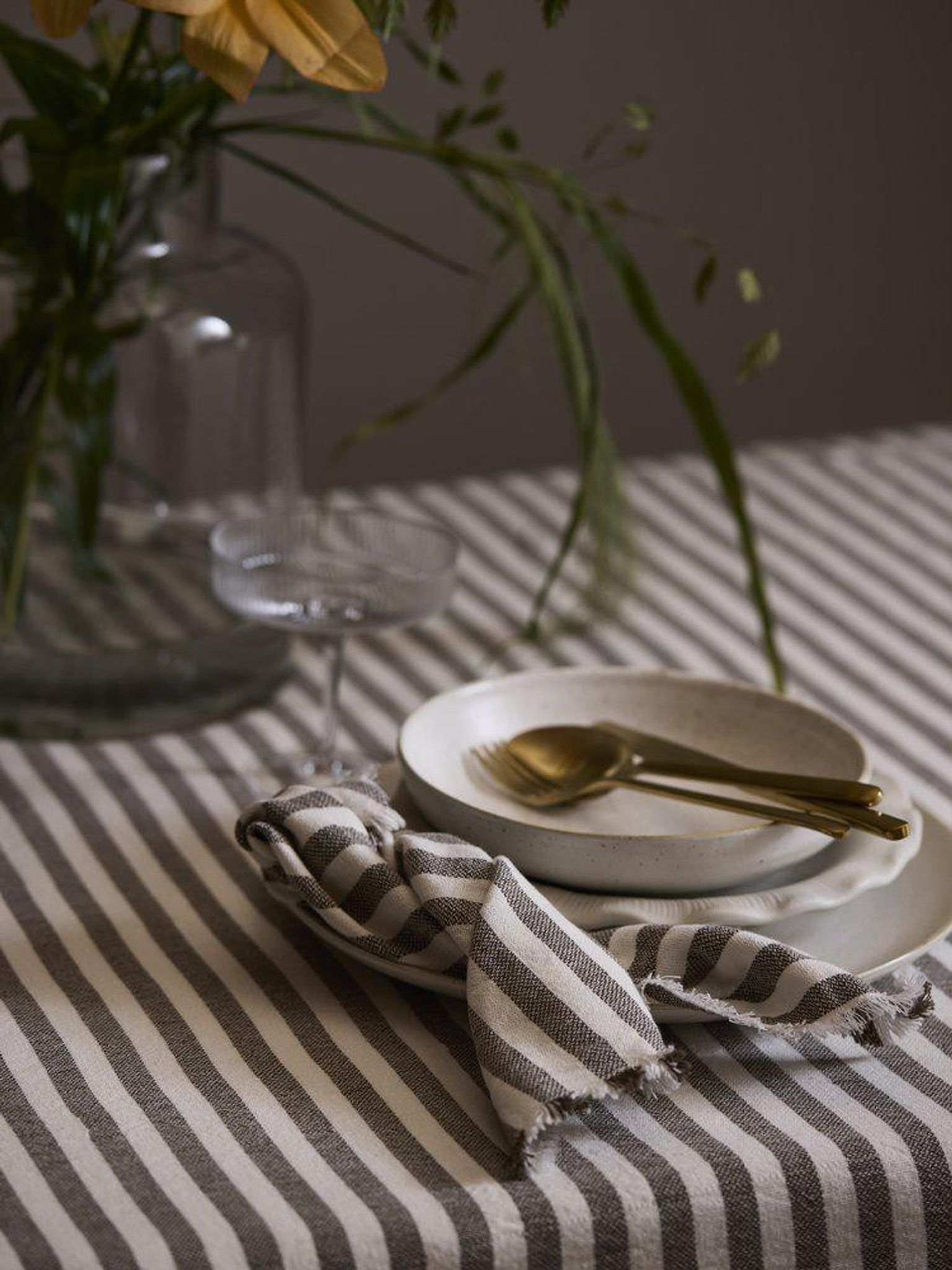 Gaby-servetten kombinerar funktion och form så att du enkelt får en välgjord dukning. Bomullen gör den mjuk att vika och lägga på tallriken, samtidigt som randen och fransarna ger en extra detalj som höjer helheten. Servetten fungerar lika bra vid vardagsmåltider som vid gästmottagningar och gör det lättare för dig att skapa en genomtänkt dukning snabbt.