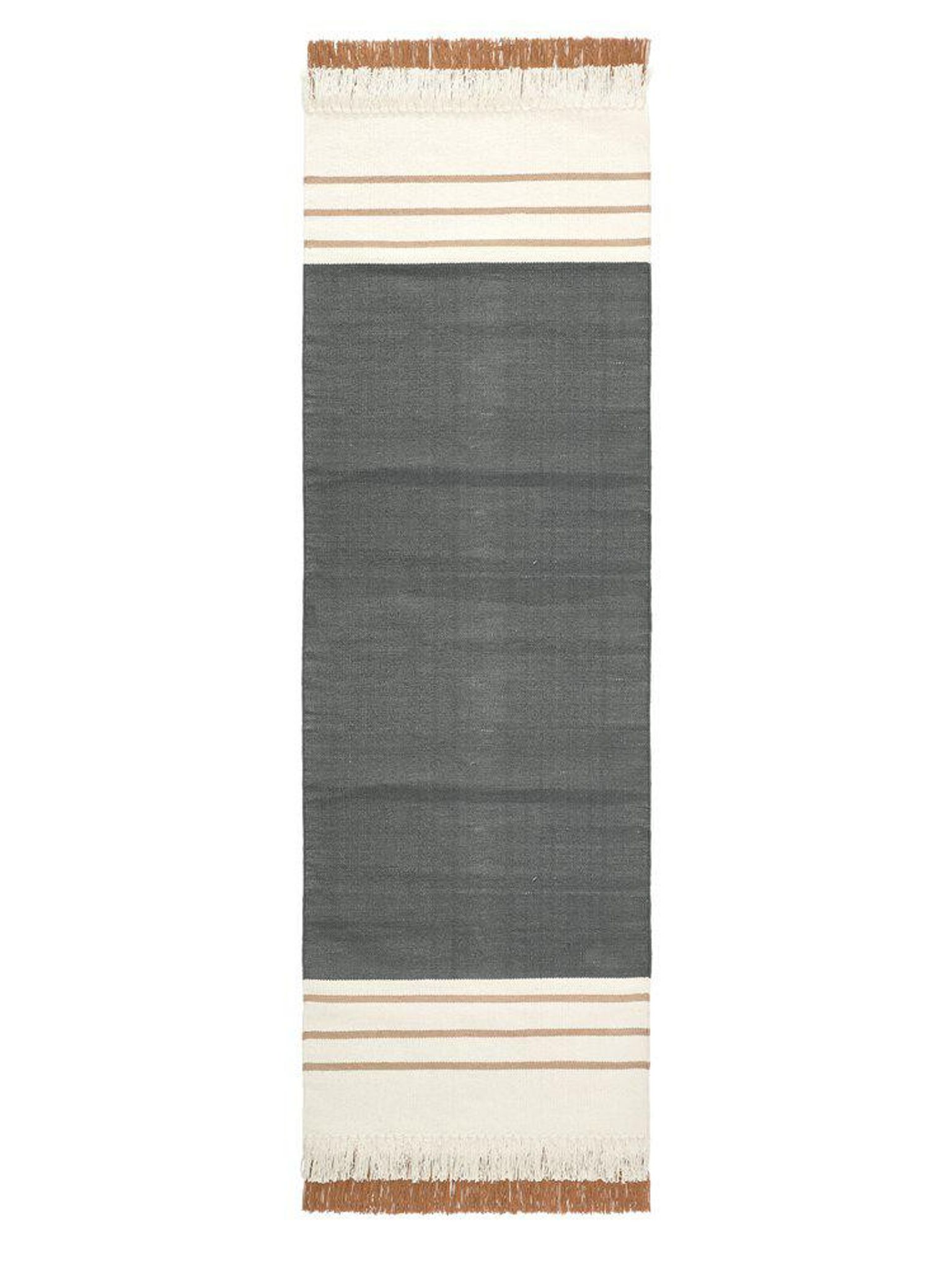 Jackie matta 70x240 cm, tunn bomull i gråsvart randigt/rutigt mönster med fransar, OEKO-TEX®-certifierad. Passar i din hall eller längs din säng, funkar som en praktisk, snygg matta som håller länge och är bra.