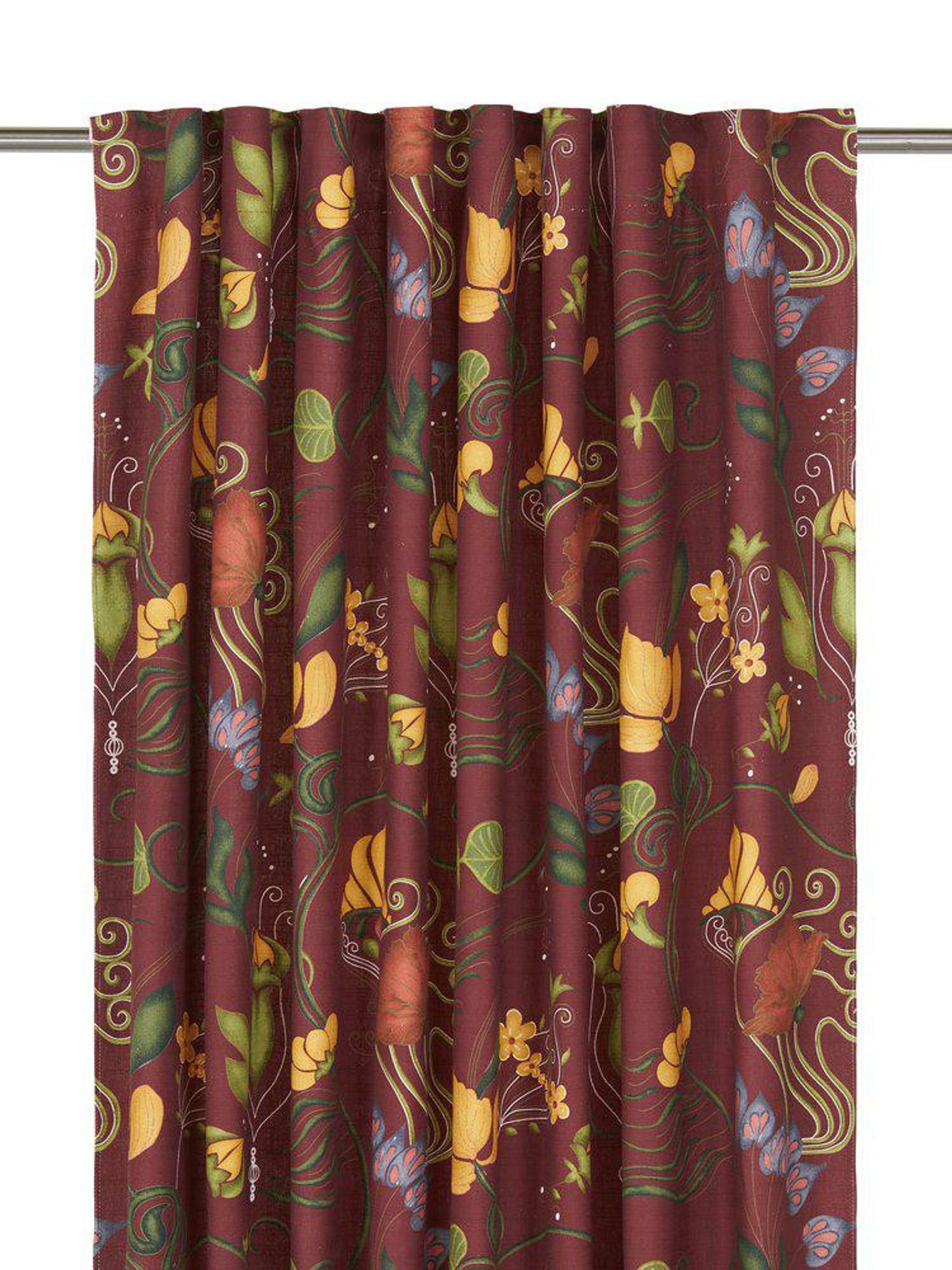 Vinröd gardin med multiband från Svanefors — en gardin som passar i vardagsrum, sovrum eller matsal. Multibandet gör den enkel att hänga och du kan välja mellan mjuka veck eller ett rakt fall för den stämning du vill ha i rummet.