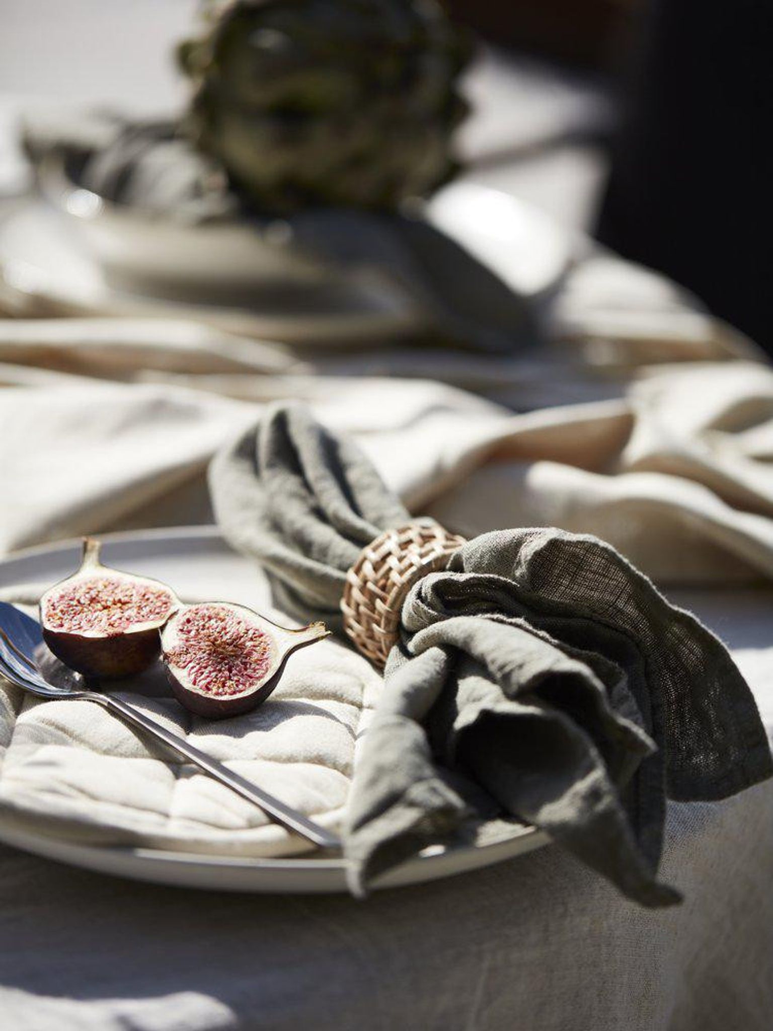 - Rustik struktur: Den lätt skrynkliga ytan ger karaktär åt dukningen.