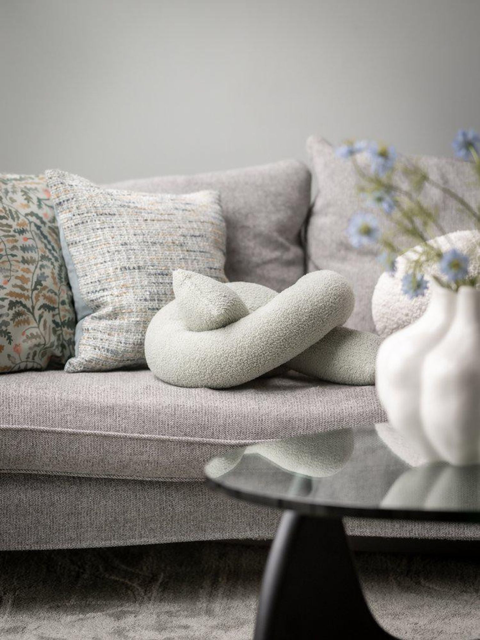 En knutformad turkos prydnadskudde som ger både form och funktion i ditt hem. Den passar på soffa, säng eller fåtölj och fungerar som en dekorativ detalj samtidigt som den ger stöd när du vilar eller myser.