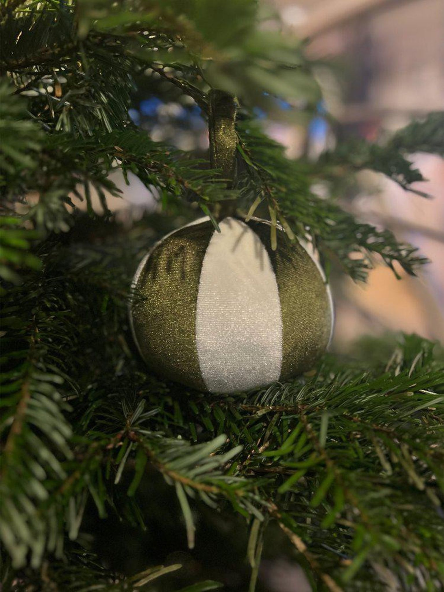 Grön sammetkula 10 cm, 2-pack från Svanefors med ögla för enkel upphängning. Snygg och praktisk dekoration som passar i granen eller ditt hem; funkar bra och håller länge och ger ett randigt/rutigt inslag.
