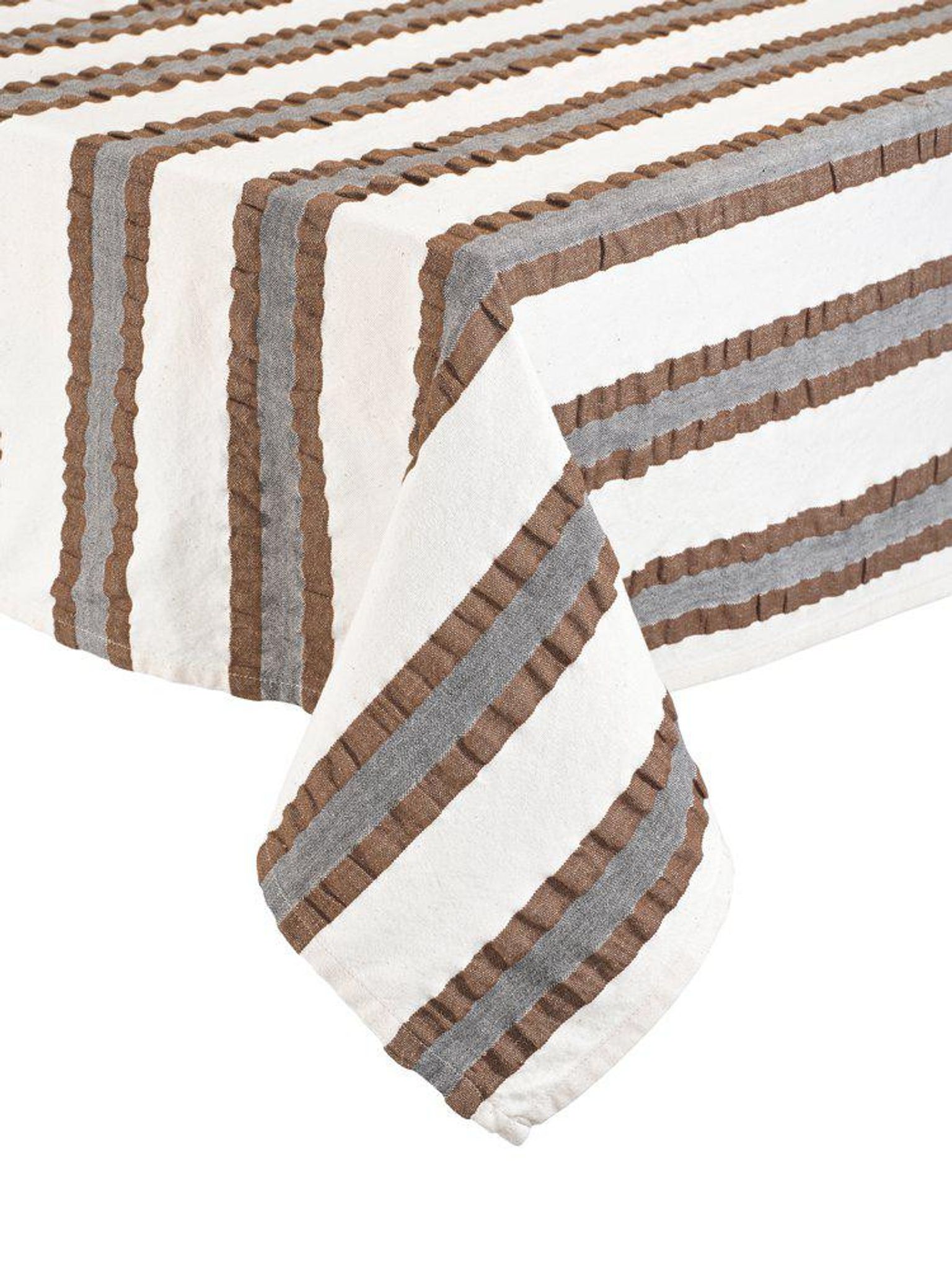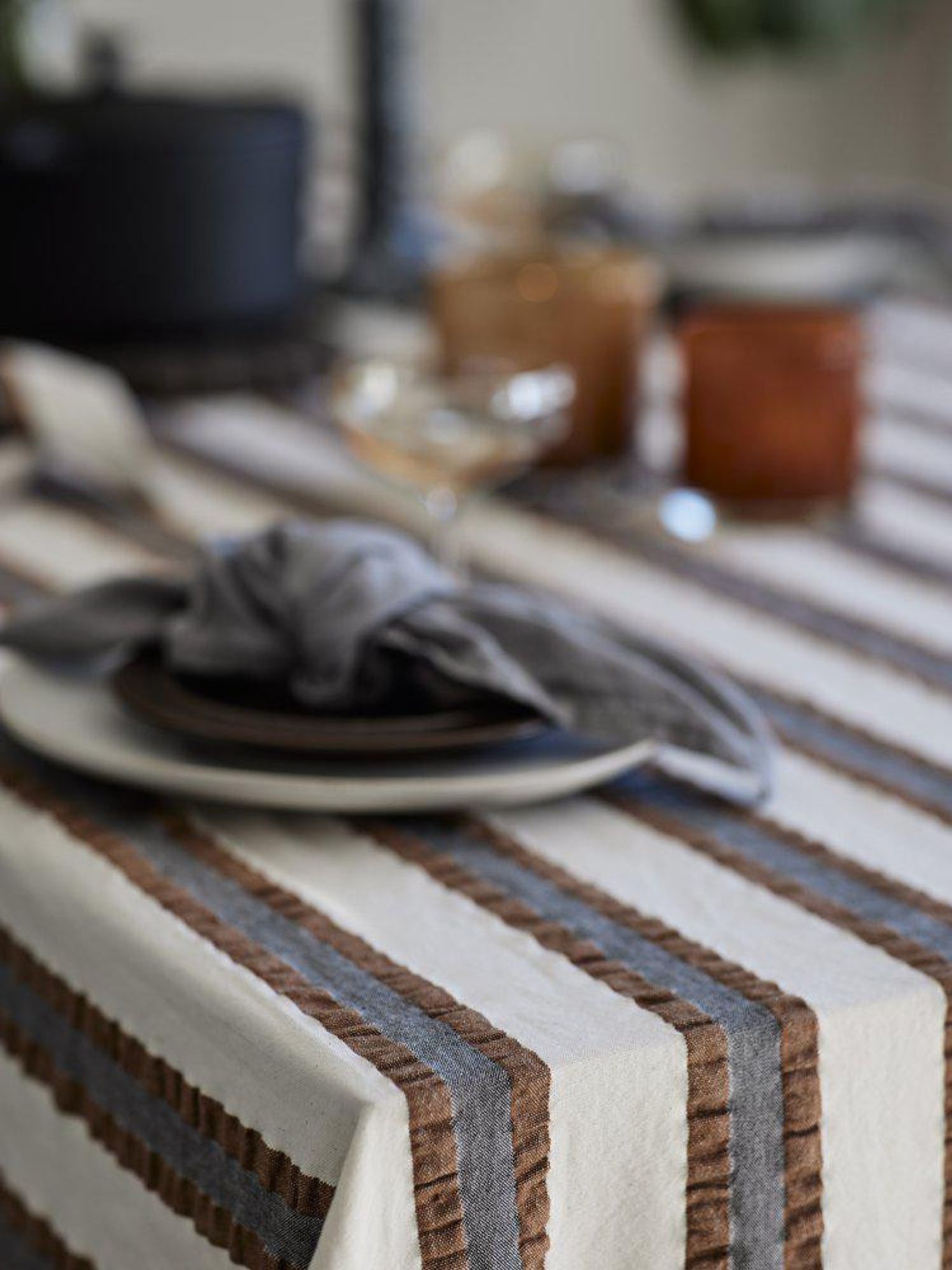 Den randiga, mellanbruna duken ger en varm och inbjudande känsla vid bordet och fungerar både till vardags och vid mer formella tillfällen. Storleken gör den flexibel för olika bord och dukningar.