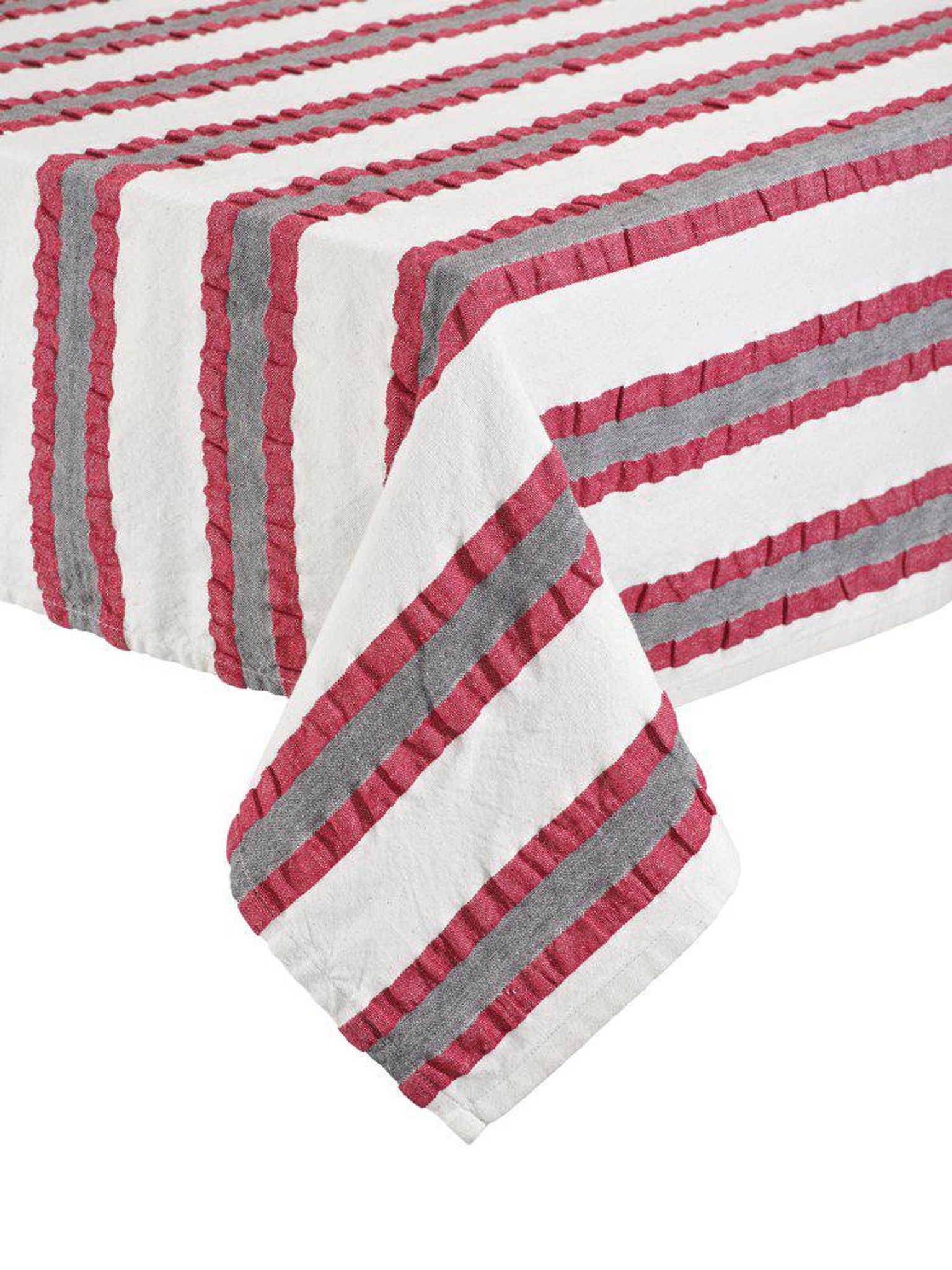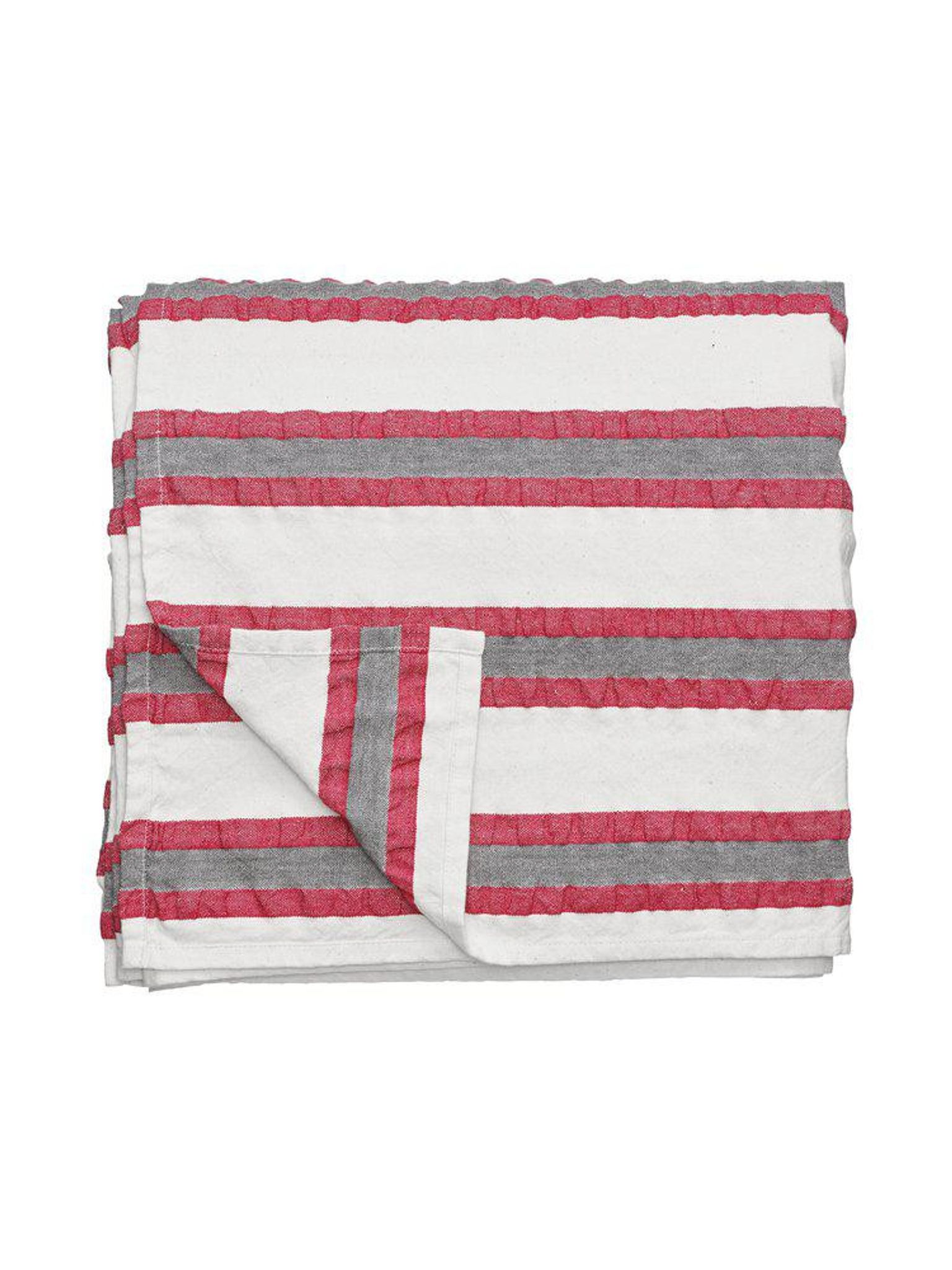 Duk Lollo 145x280 cm från Svanefors i röd bomull med garnfärgat randigt mönster, OEKO-TEX-certifierad. Passar ditt matbord och funkar bra vid dukning; praktisk, håller länge och snygg.
