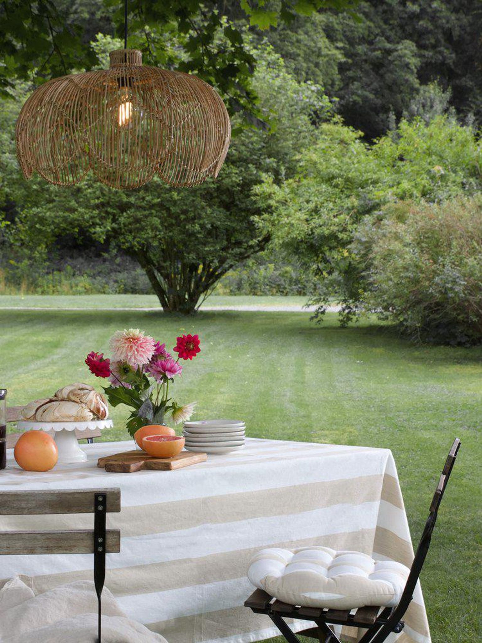 Duken är gjord av 100% bomull och mäter 145x250 cm, vilket ger bra täckning för större bord. Den är OEKO-TEX®-certifierad och enkel att hålla ren — maskintvätt 40°C, undvik klorblekmedel, torktumla ej och stryk på medelhög temperatur.