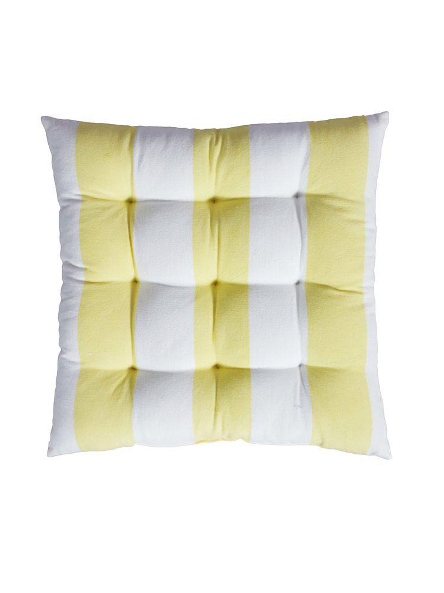 Gul Louise stolsdyna 40x40 cm i mjuk bomull med dekorativa stygn och polyesterfyllning, certifierad enligt STANDARD 100 by OEKO-TEX®. Passar utomhus och funkar bra på din stol, snygg, praktisk och håller länge.