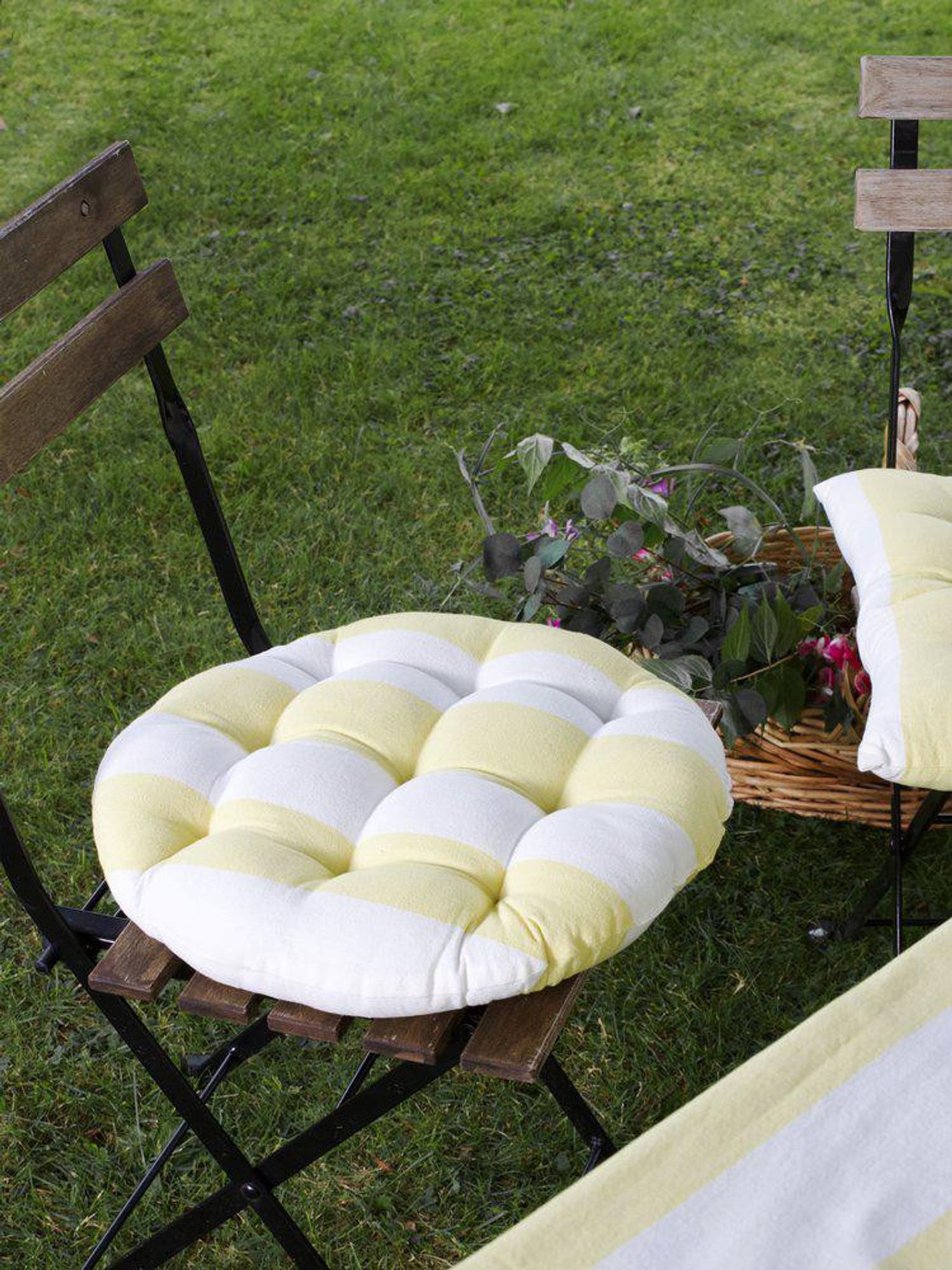 Stolsdyna Louise D40 cm i gul bomull med randigt/rutigt mönster, polyesterfyllning, eko-vänlig och STANDARD 100 by OEKO-TEX®. Passar utomhus på din stol, funkar bra, är praktisk, snygg och håller länge.