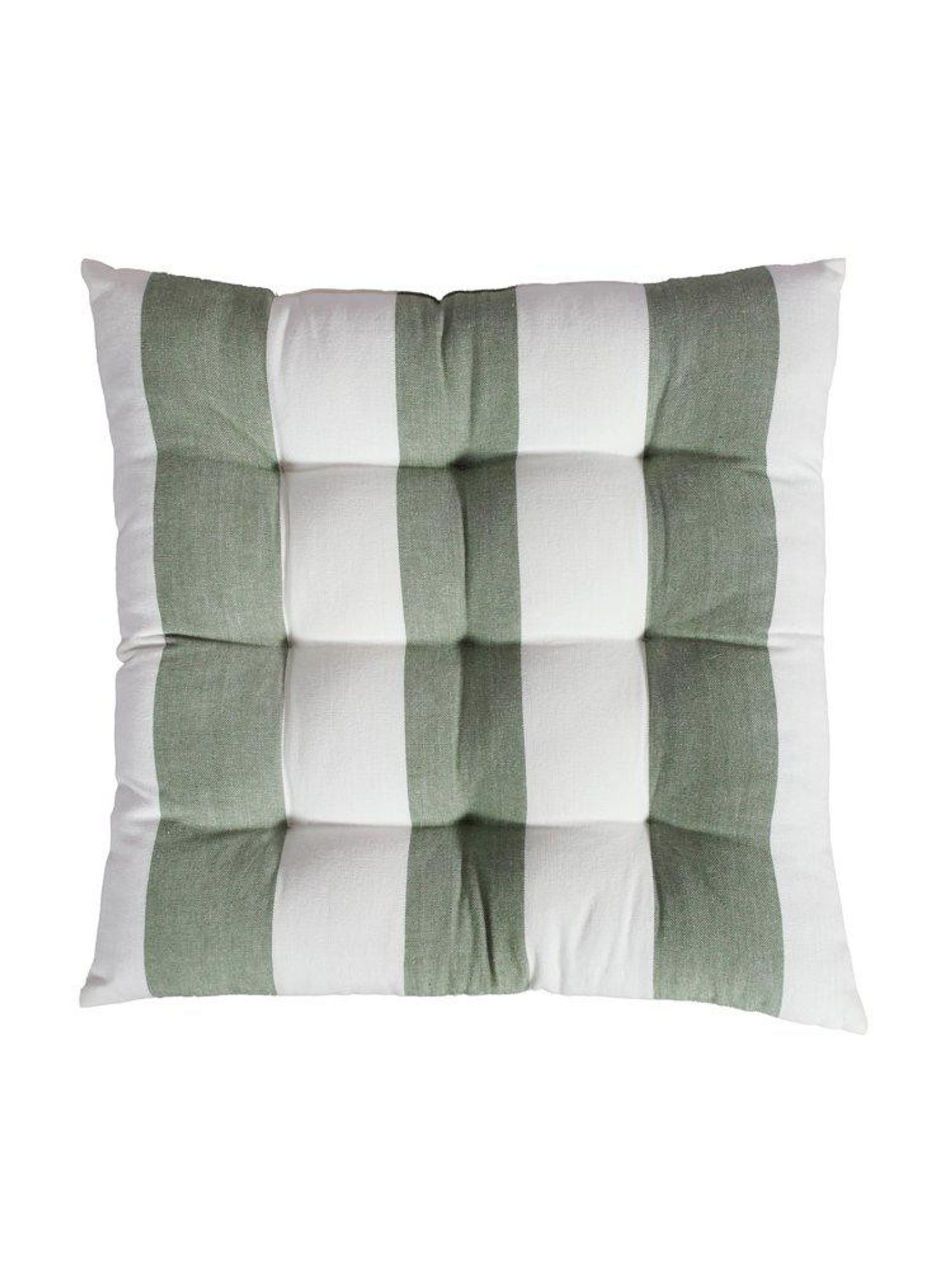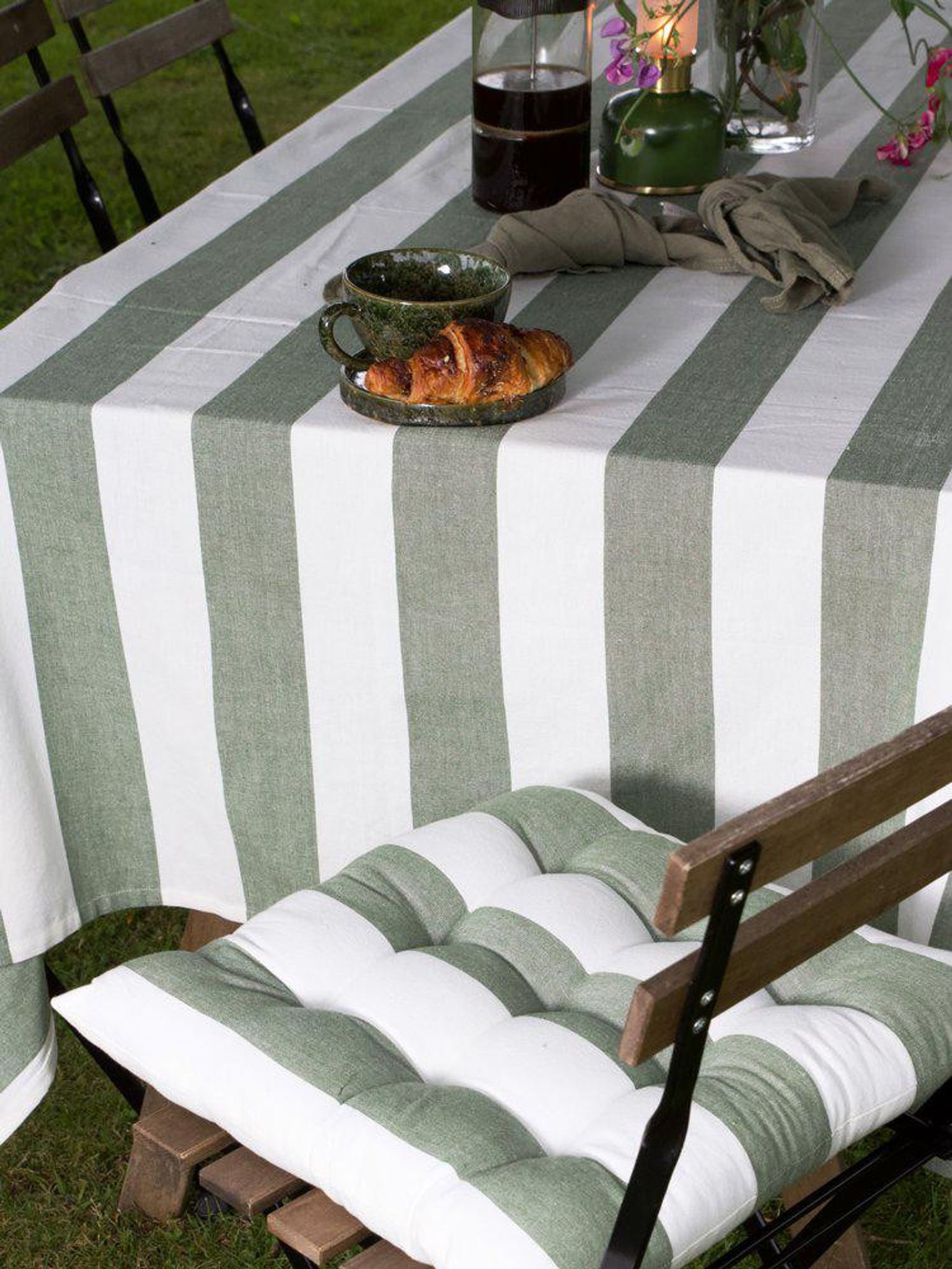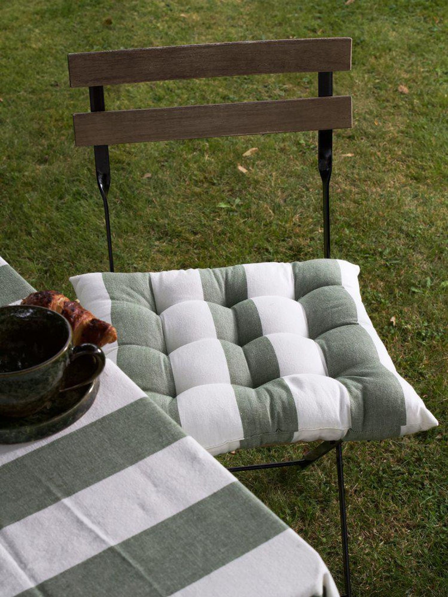 Stolsdyna Louise 40x40 cm i bomull, grön mossa med randigt/rutigt mönster, polyesterfyllning och OEKO-TEX-certifikat; snygg och håller länge. Passar din utemöbel eller stol, funkar bra och är praktisk att använda.