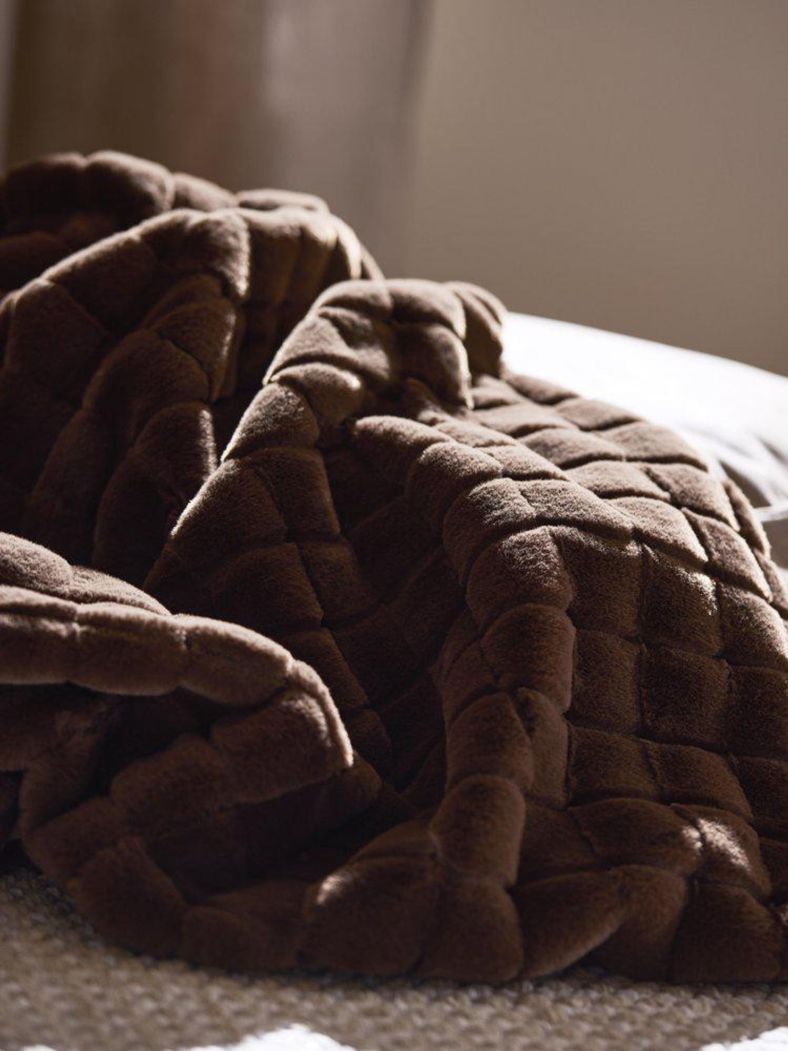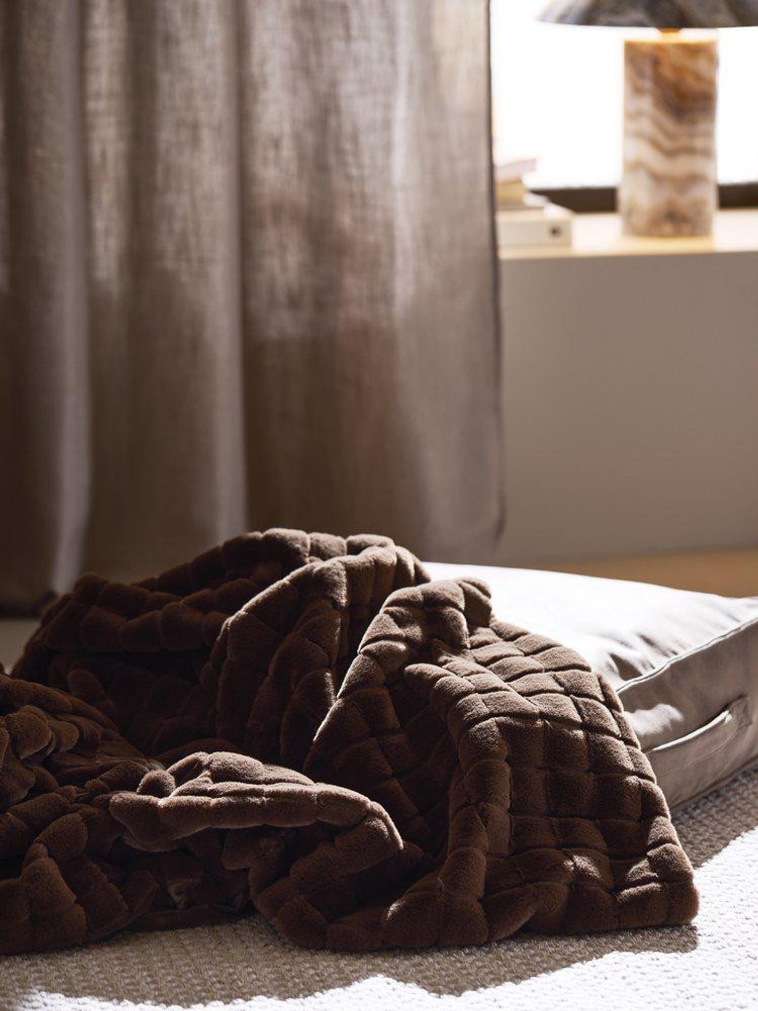 Luna Pläd i brun pälsimitation är en mjuk och värmande pläd som passar i vardagsrummet, på soffan eller i sängen. Den mjuka framsidan i fuskpäls och det följsamma tyget på baksidan gör den enkel att svepa om sig vid kalla kvällar eller använda som dekorativ filt i din inredning.