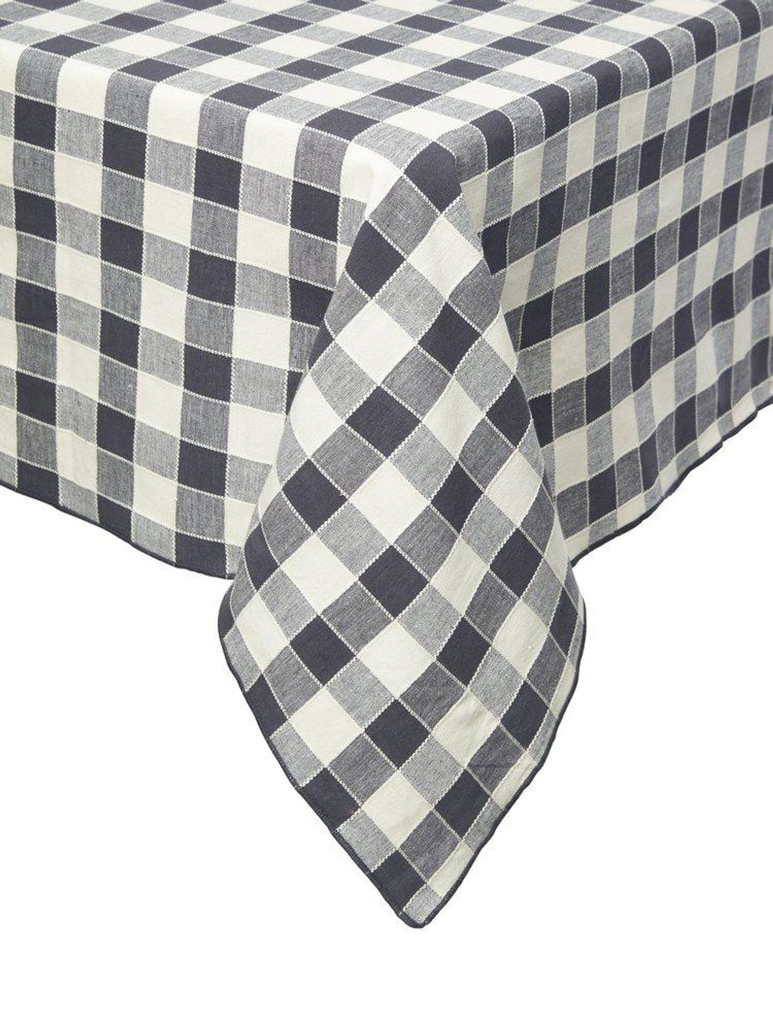 Mary bordsduk 140x250 cm i bomull med garnfärgade rutor och överlockade kanter, grå. Passar på ditt matbord, funkar bra, håller länge och är praktisk och snygg; certifierad STANDARD 100 by OEKO-TEX®.