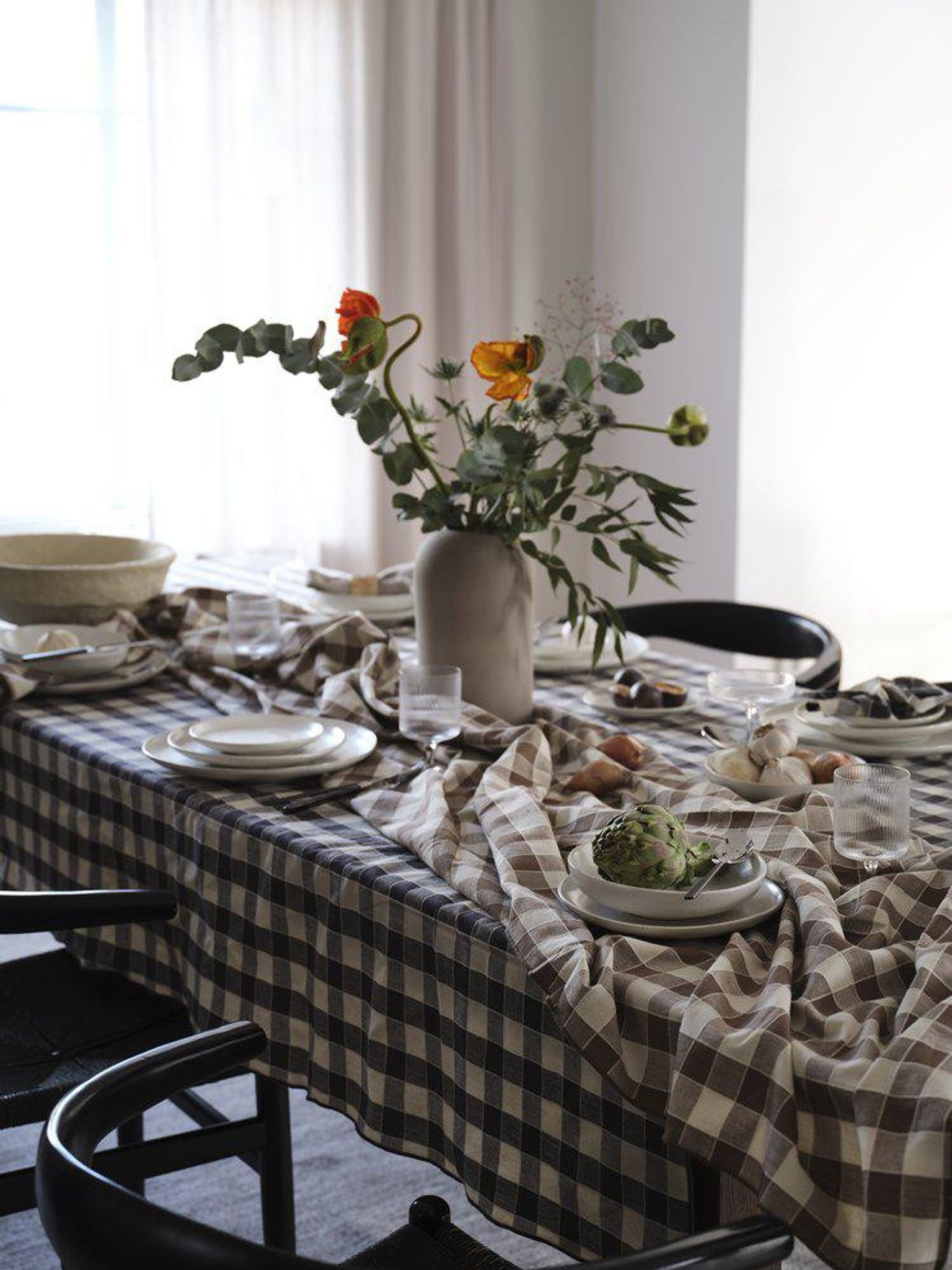 Mary DukAsfalt är en bomullsduk i grå rutig design som ger en ren och ombonad känsla vid bordet. Mönstret passar enkelt ihop med olika dukningar så att du snabbt får en enhetlig stil.