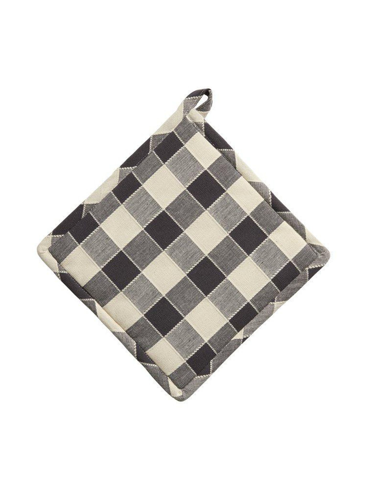 Mary grytlapp 22x22 cm i bomull med gråsvart rutig design, OEKO-TEX Standard 100. Den passar i ditt kök, funkar som grytunderlägg och håller länge; snygg, praktisk och bra.