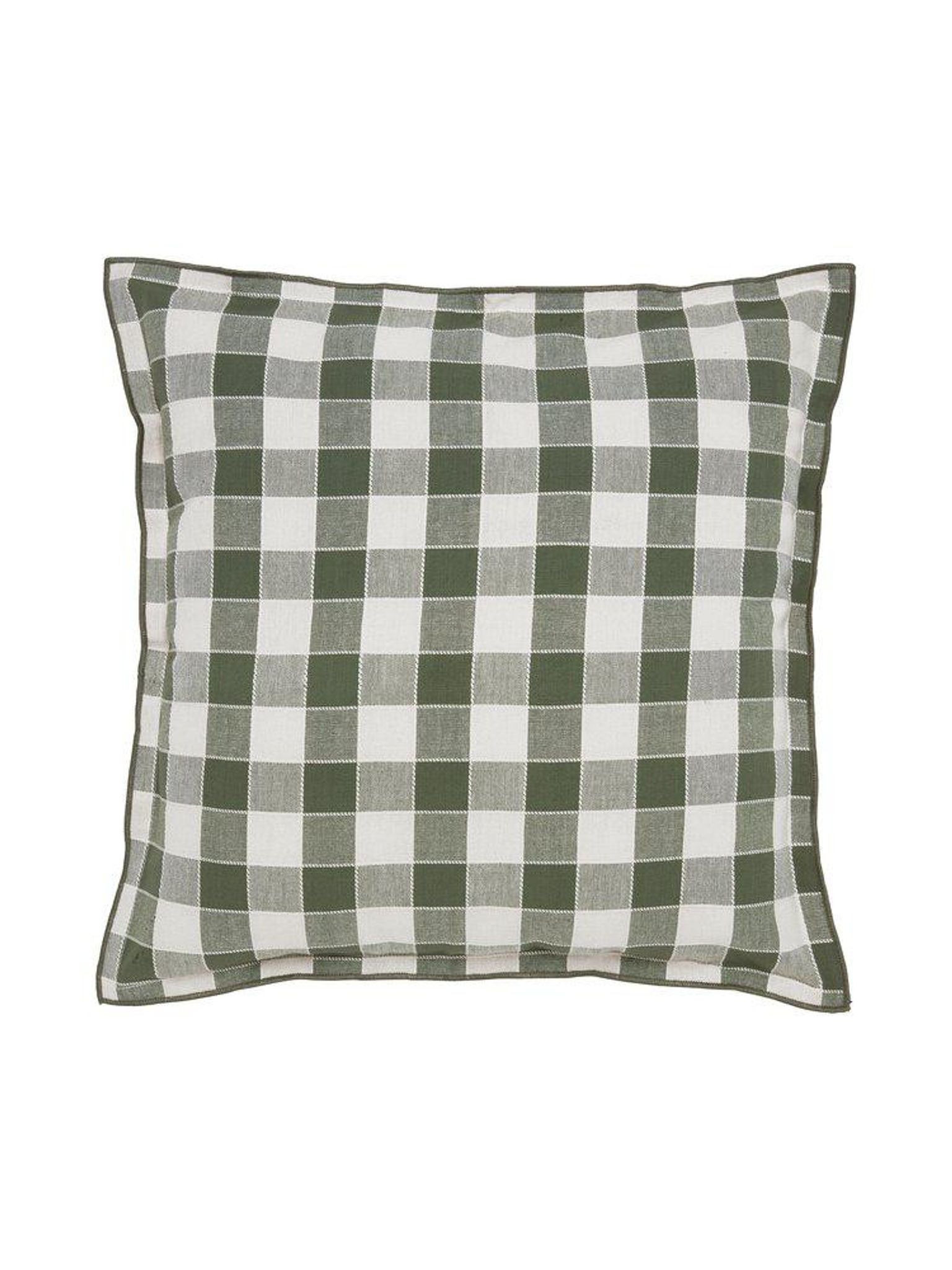 Svanefors Mary kuddfodral 45x45 cm i grön bomull med garnfärgade rutor och overlockade kanter, STANDARD 100 by OEKO-TEX. Snygg, praktisk fodral som passar din soffa eller säng, funkar bra i vardagsrum och håller länge.