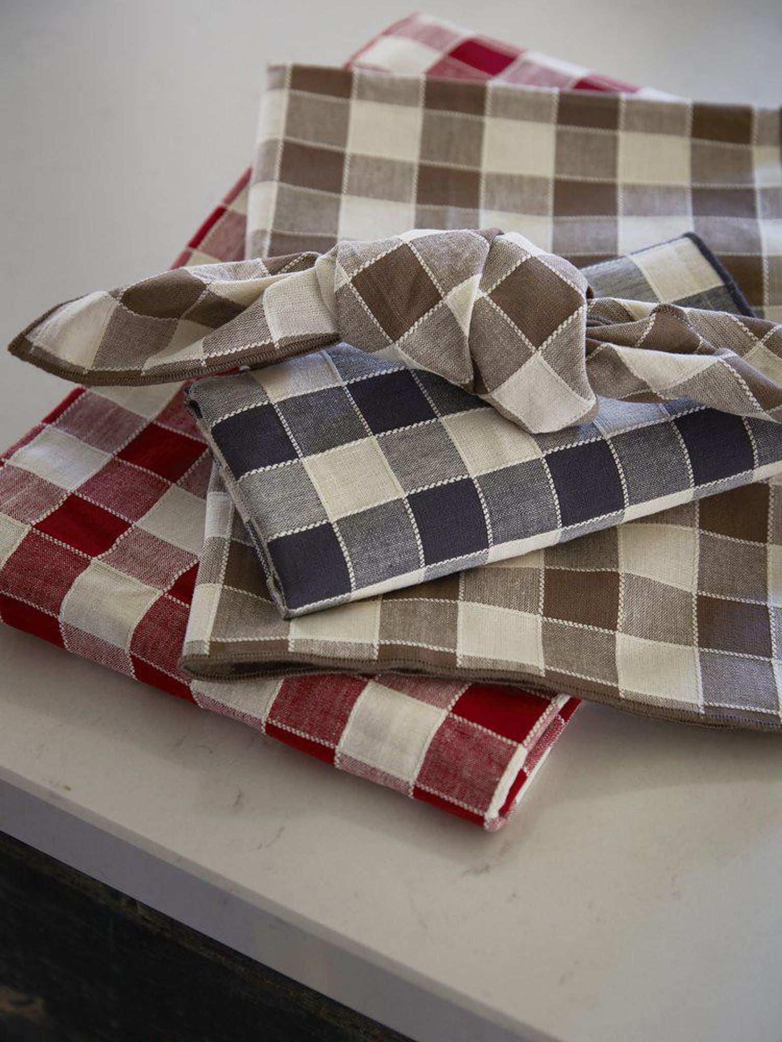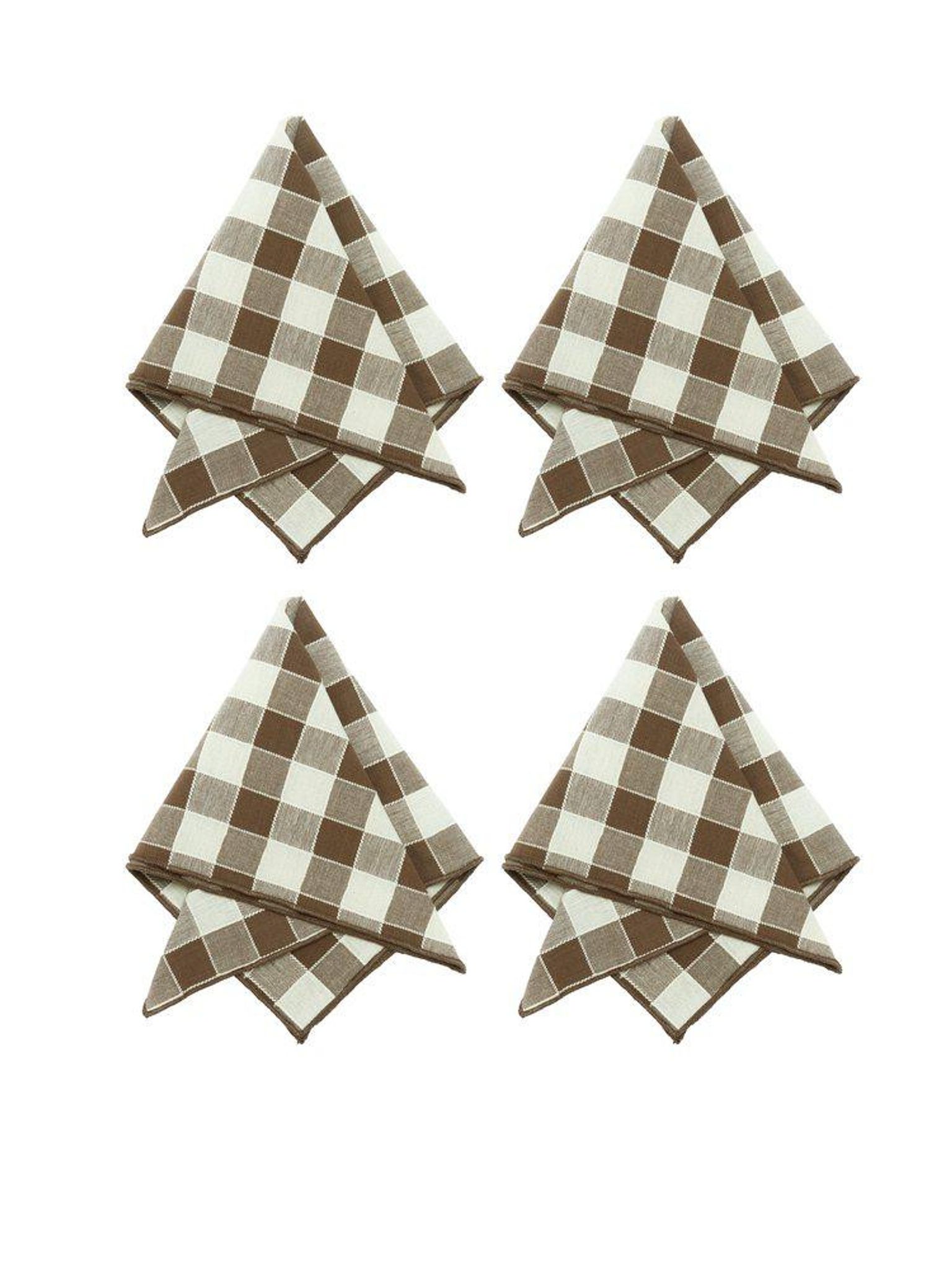 Servett 45x45 cm i bomull, brun med garnfärgat randigt/rutigt mönster och overlockade kanter, STANDARD 100 by OEKO-TEX. Snygg och praktisk – den håller länge, passar din dukning och funkar bra vid vardag eller fest.