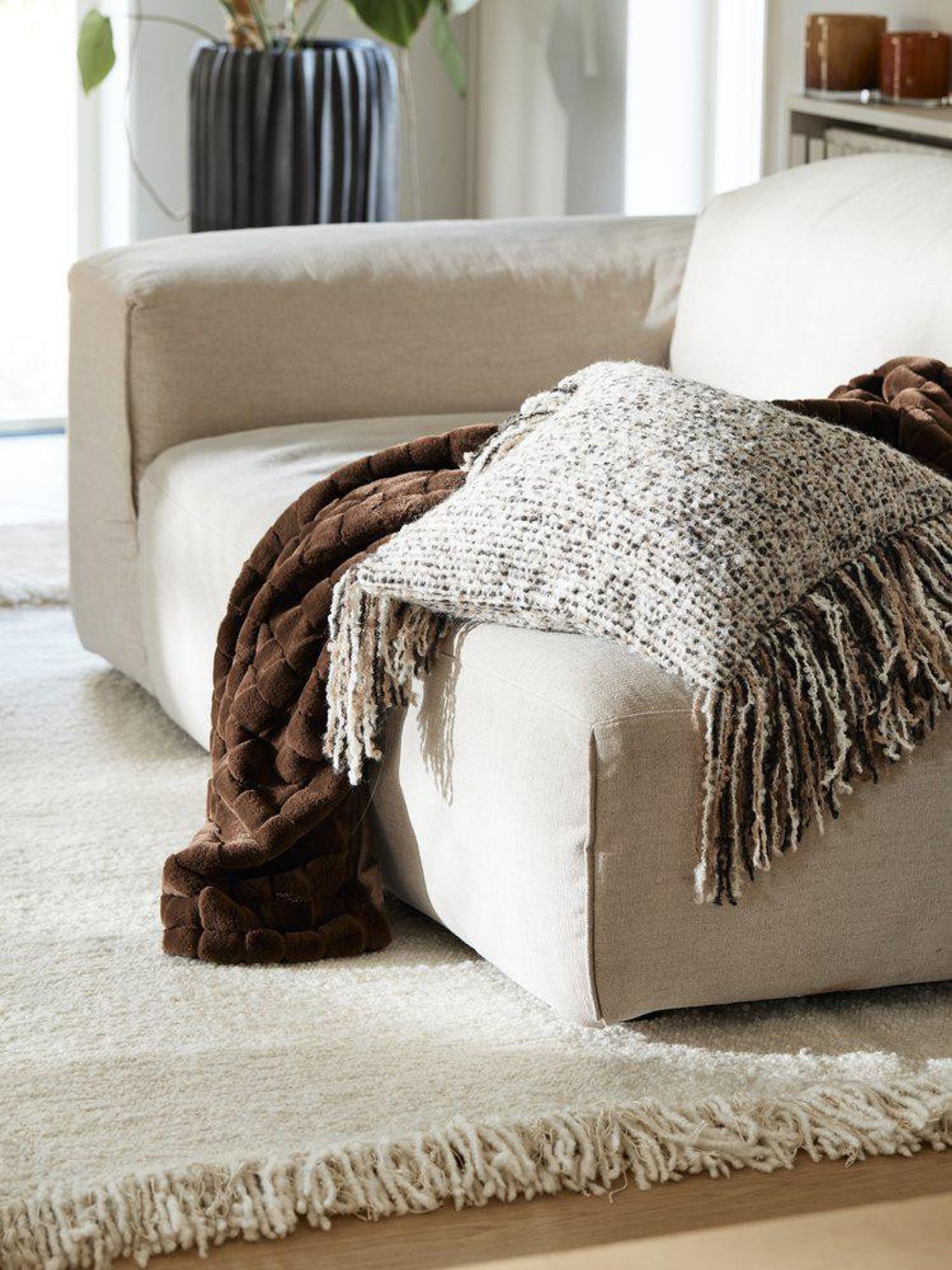 Naomi Kudde ger både komfort och stil i vardagen. Ullblandningen känns mjuk mot ryggen när du lutar dig tillbaka, och de långa fransarna ger en tydlig dekoreffekt som gör rummet mer ombonat. Den medföljande innerkudden gör det enkelt för dig att använda kudden direkt.