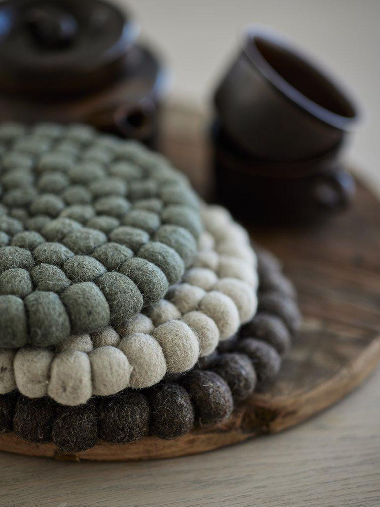 Ullen fungerar som ett effektivt isolerande lager så att heta kastruller och stekpannor inte skadar dina ytor. De tovade bollarna bidrar till ett stadigt underlag och minskar risken för att kastrullen glider. Designen är genomtänkt för både funktion och stil i vardagsköket.