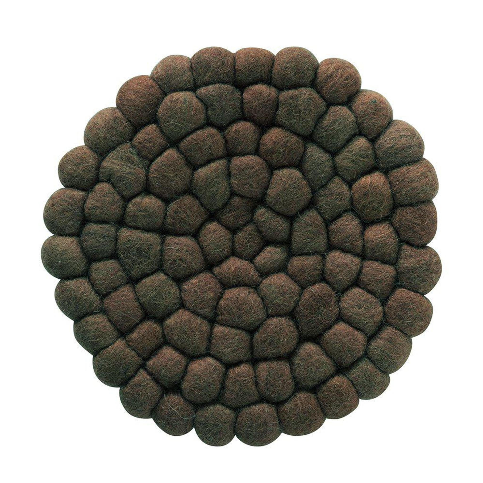 Brun Nisha Grytunderlägg i ull med tovade bollar är ett grytunderlägg som skyddar dina bord och bänkar från varma kastruller. Det passar i köket och på matbordet när du lagar mat eller dukar för gäster — en praktisk detalj som hjälper dig undvika brännmärken och repor.