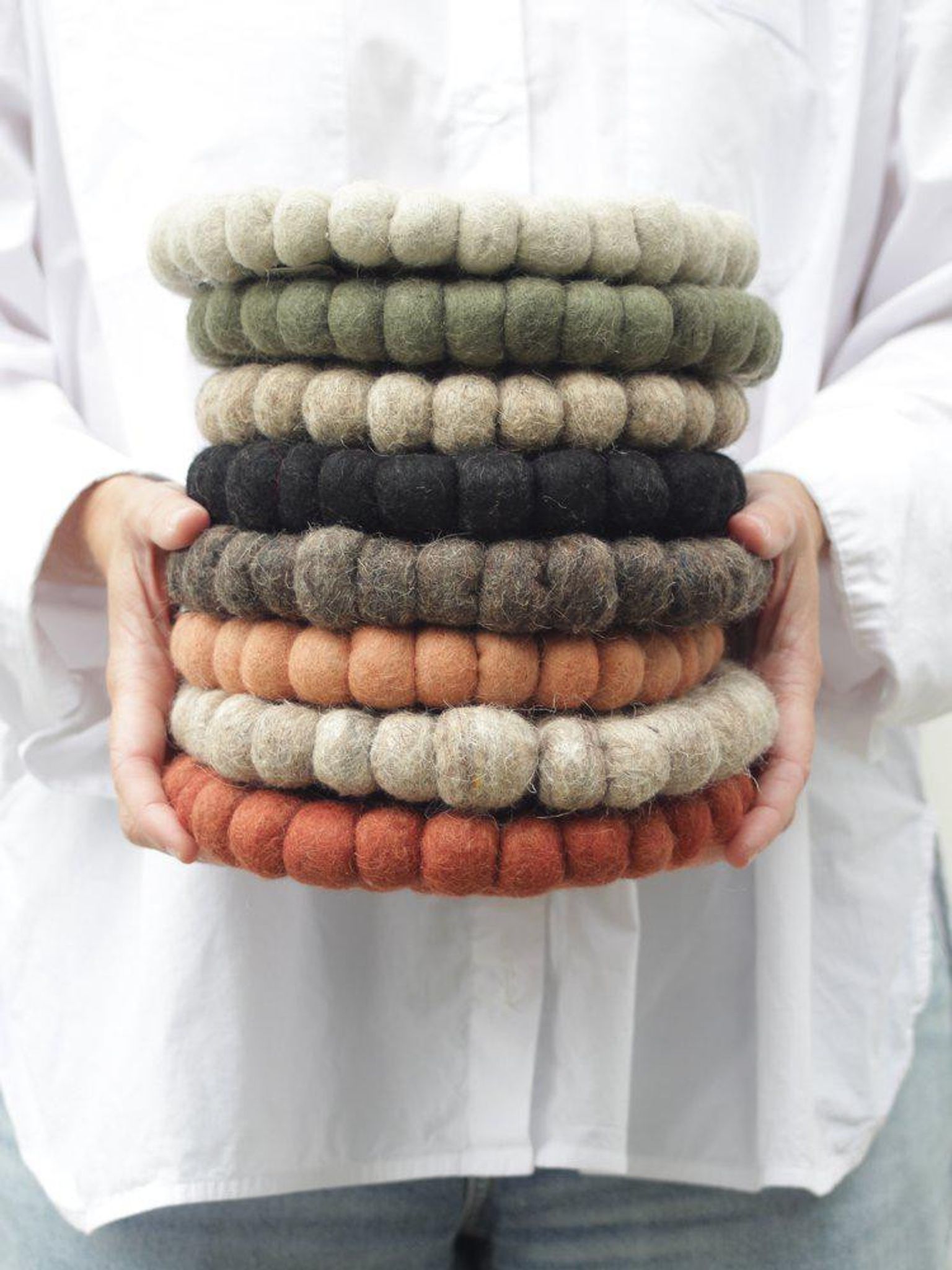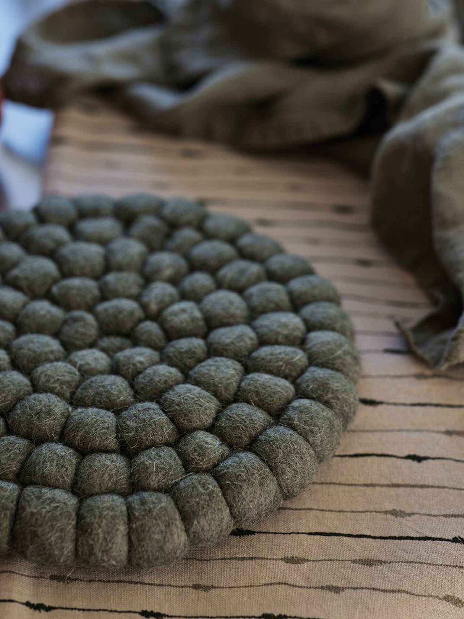 Grön ullgrytunderlägg med tovade bollar som skyddar ditt bord från varma grytor. Det här underlägget passar i köket, på matbordet eller buffén — ett grytunderlägg/ullunderlägg som både skyddar ytor och ger en varm, grön detalj i ditt hem.