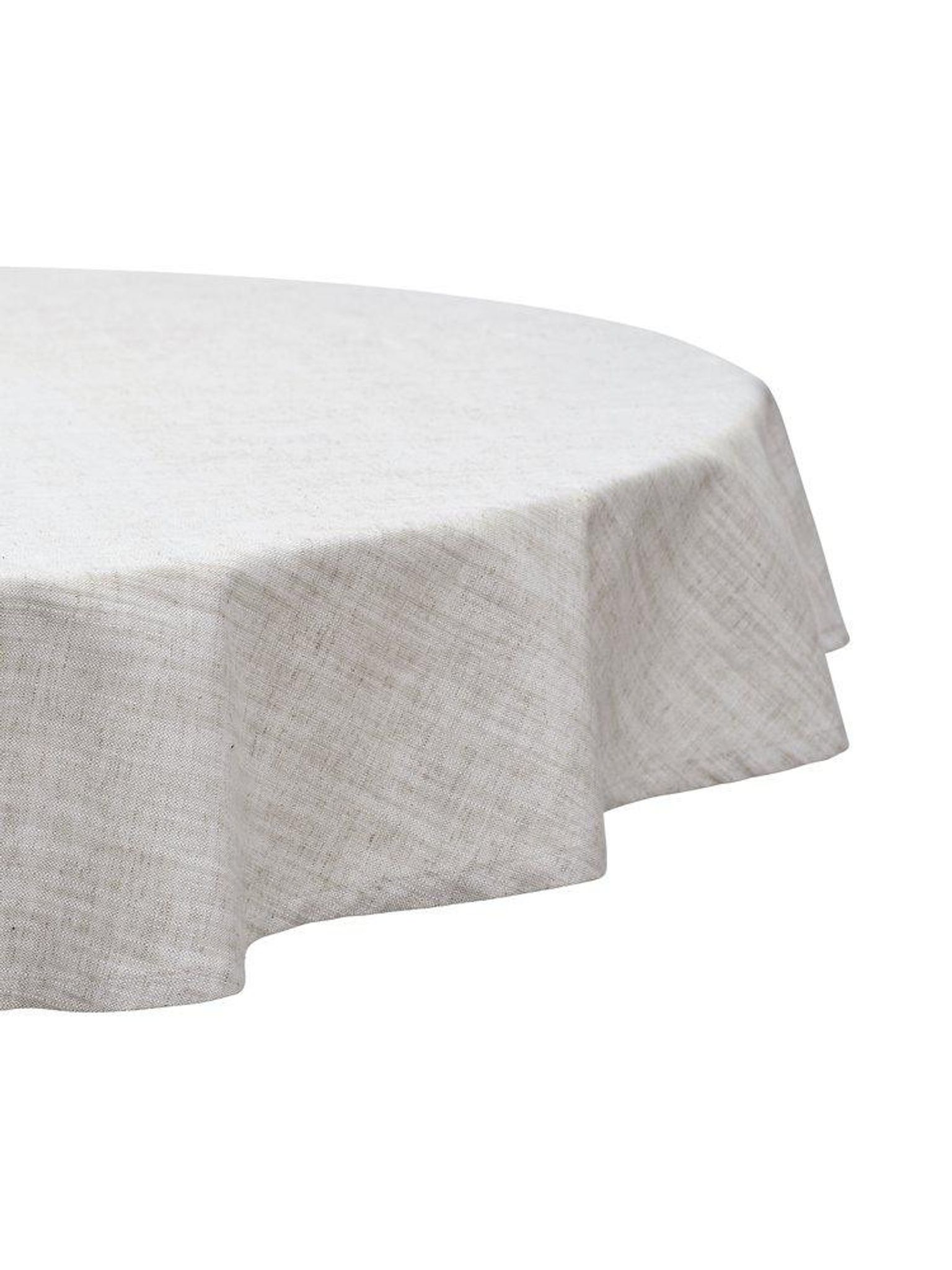 Sabina rund duk 200 cm i beige bomull/linneblandning med Chambrey Finish och 40x36 trådtäthet. Passar ditt bord, funkar till vardag och fest, håller länge, är snygg, praktisk och bra samt certifierad STANDARD 100 by OEKO-TEX®.