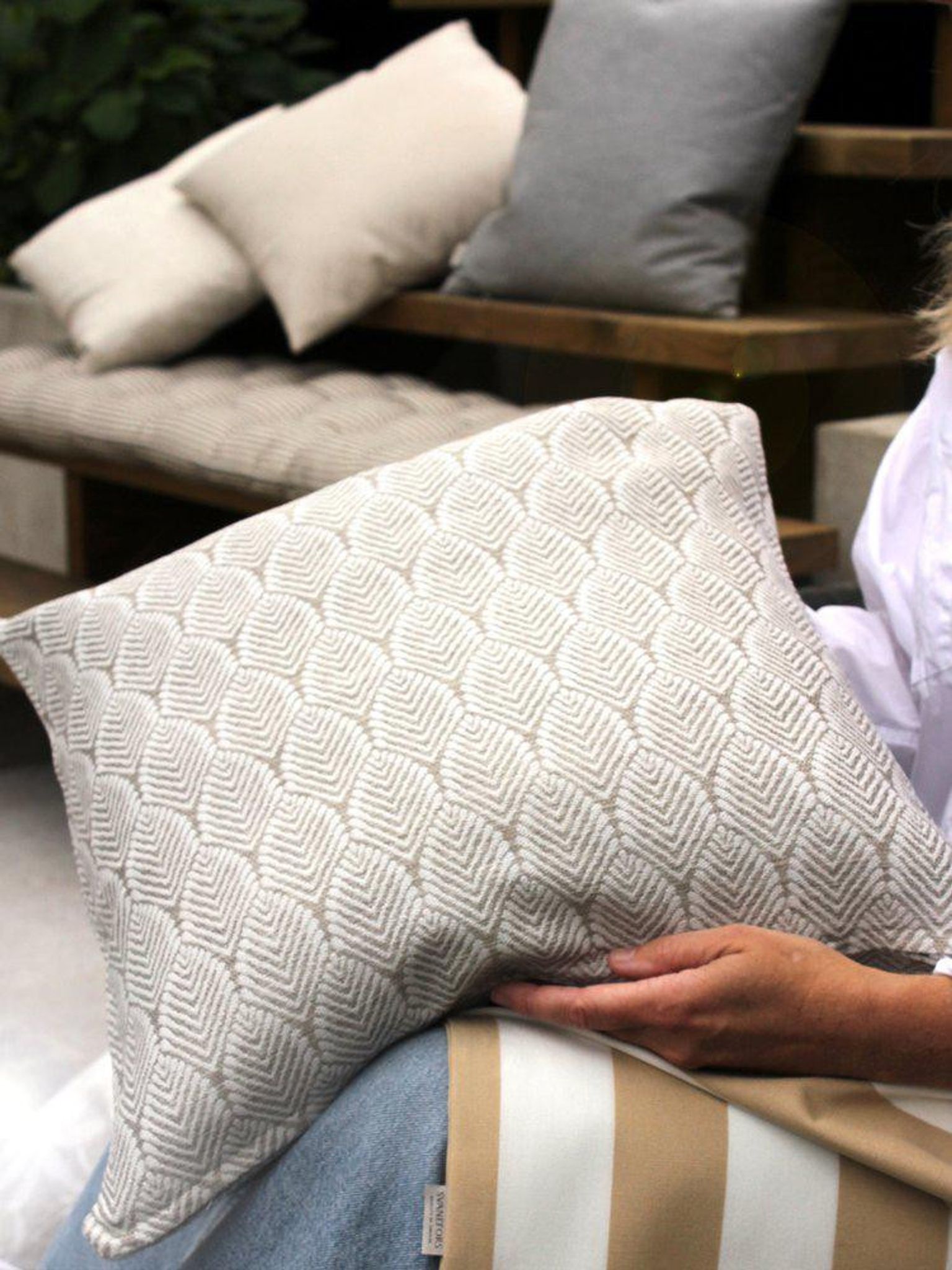 - Neutral färg: Beige mönster som passar många ute‑stilar och gör det lätt att matcha med andra kuddar.