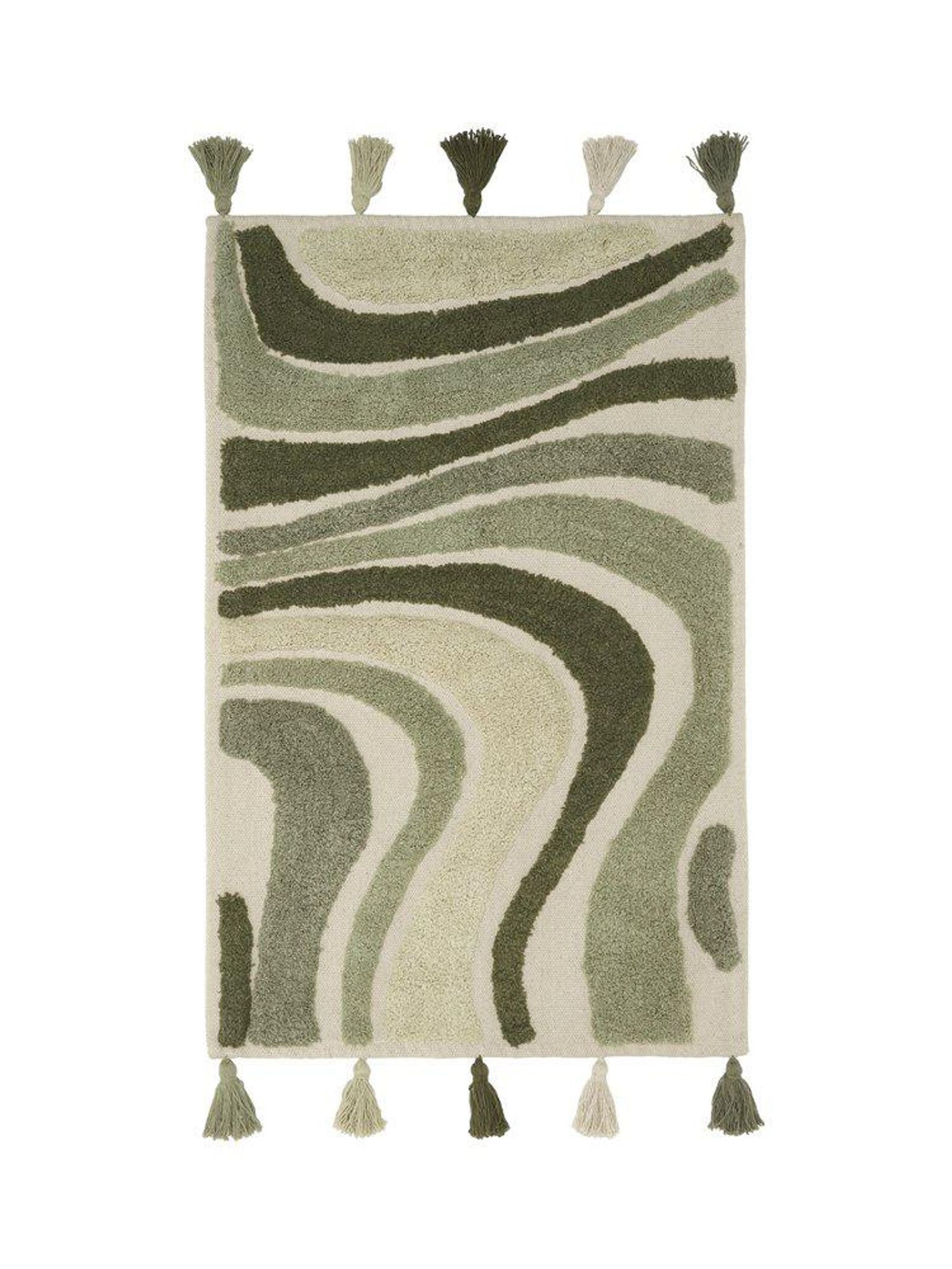 Swirl Mossa tuftad bomullsmatta 90x130 cm i grön mossa-finish med tofsar, certifierad säker och halkfri design. Den passar i ditt vardagsrum, funkar som lugg- & ryamatta, är snygg, praktisk, håller länge och ger bra känsla.