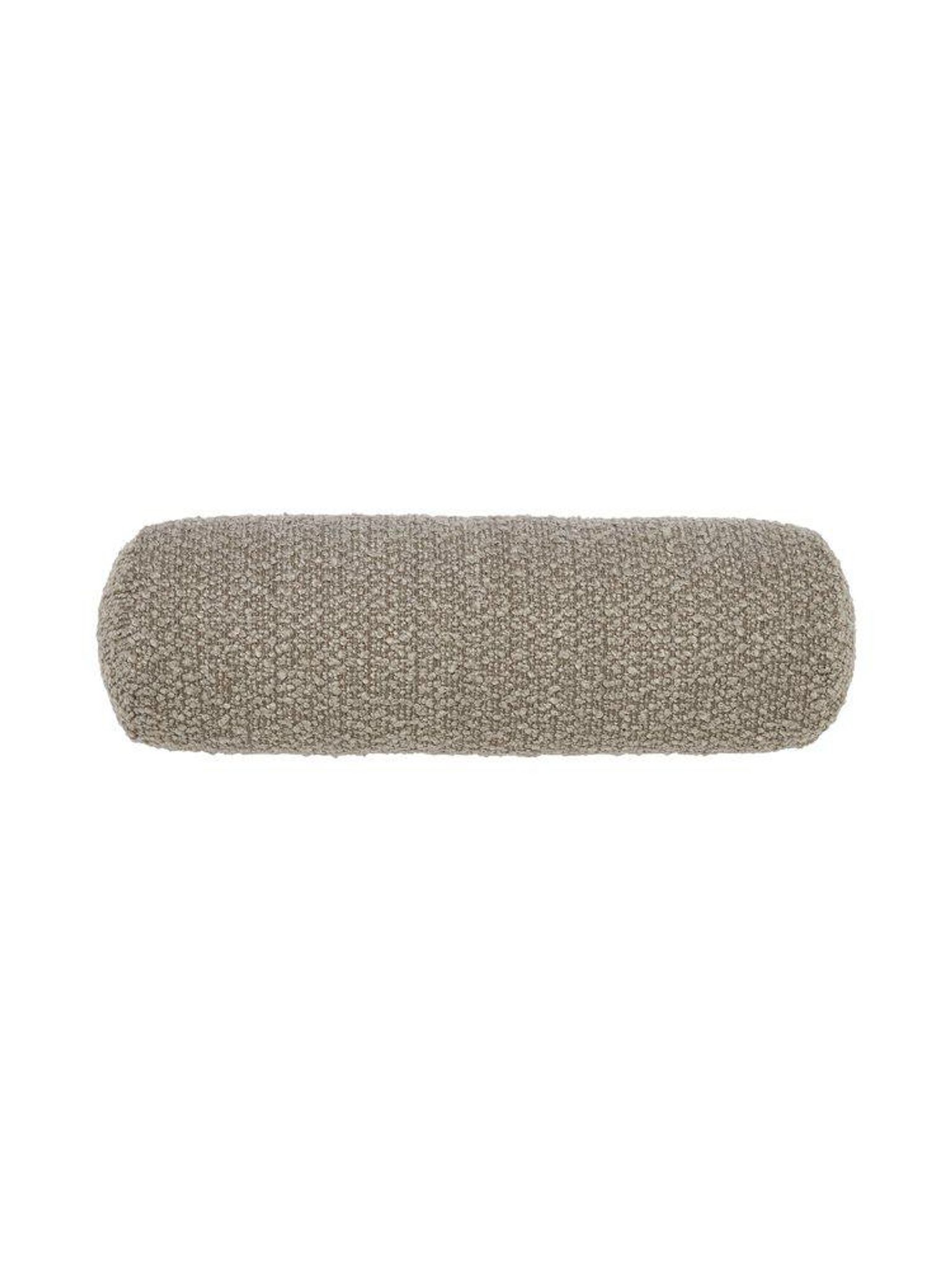 En beige, cylinderformad bouclé-kudde som ger både stöd och stil i vardagen.