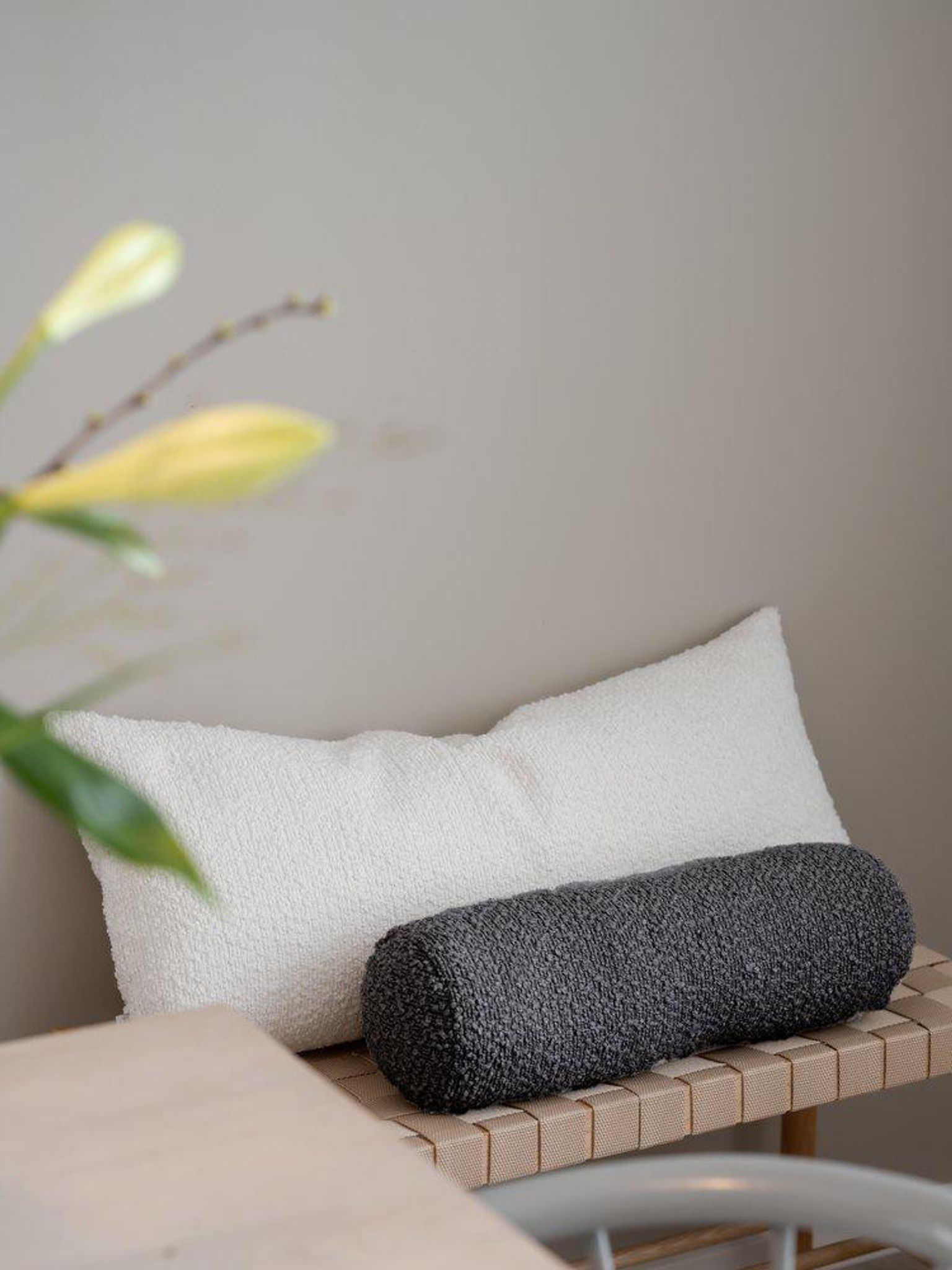 Trond cylinderformad bouclékudde i mörkgrå från Svanefors är en prydnadskudde som ger både dekor och stöd. Den passar i soffan, som extra nackstöd, eller som detalj på sängen — där du vill ha mer komfort och en ombonad känsla i ditt hem.