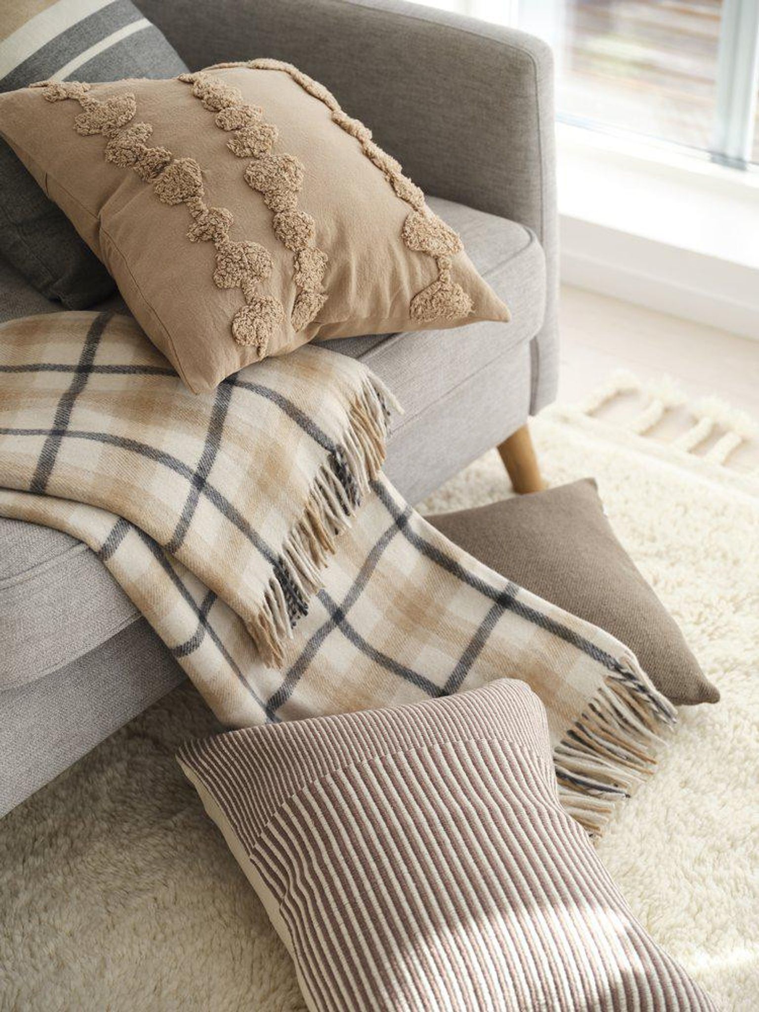 Tyra kuddfodral i nougatton är ett klassiskt kuddfodral som passar i soffan, på sängen eller som extra detalj på en fåtölj. Färgen och det garnfärgade randiga mönstret ger en varm, jordnära känsla som enkelt kompletterar din befintliga inredning.
