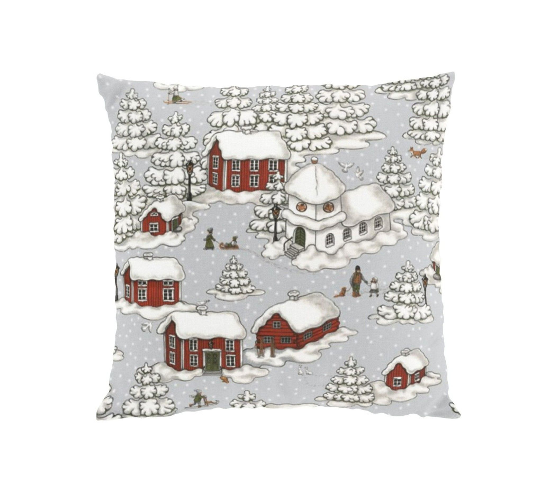 Upplev den nostalgiska charmen med Timmerbyn grå kuddfodral från Arvidssons Textil. Designat av MiaLotta Arvidsson-Mars, detta kuddfodral är en hyllning till de vackra 1900-talsbyarna, där timrade hus och snöklädda landskap skapar en magisk atmosfär.